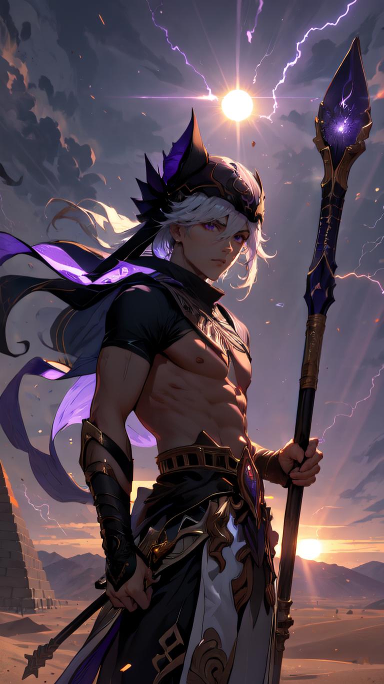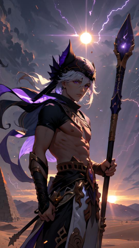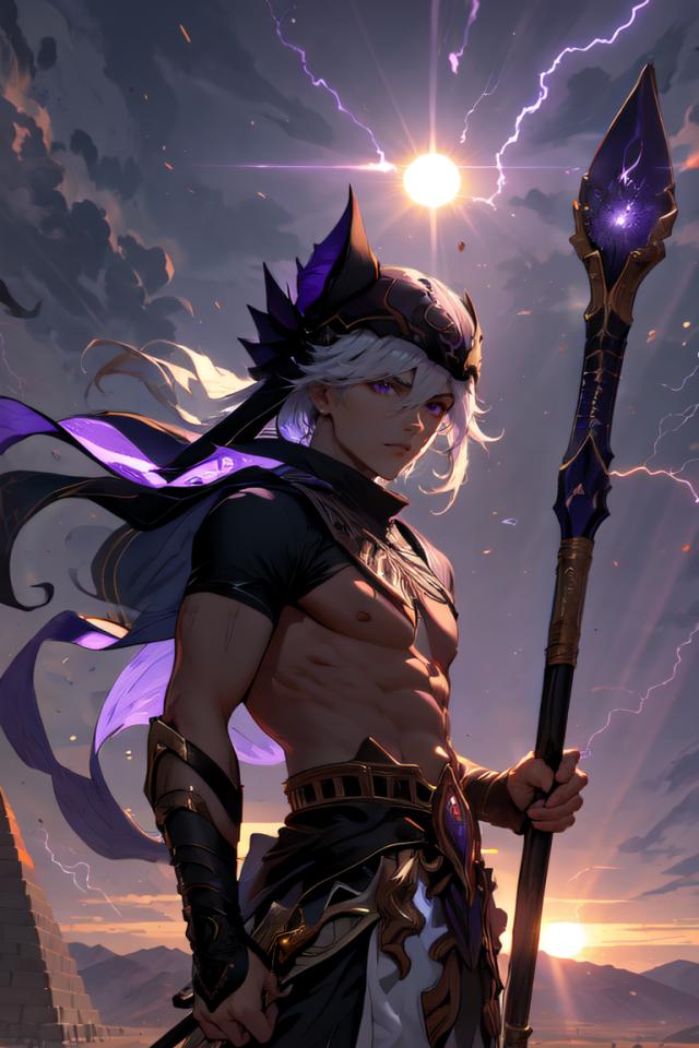 1boy, abs, animal ears, animal hat, arabian clothes , bangs, belt, black headwear, closed mouth, cloud, cloudy sky, cowboy shot, dark skin, dark-skinned male, desert, egyptian clothes, electricity, gradient sky, hair between eyes, hat, holding, holding polearm, holding staff, holding weapon, jackal ears, jewelry, lightning, long hair, looking at viewer, male focus, nipples, outdoors, pants, polearm, purple eyes, sand, serious, short sleeves, sky, solo, staff, standing, sun, sunlight, sunset, weapon, white hair