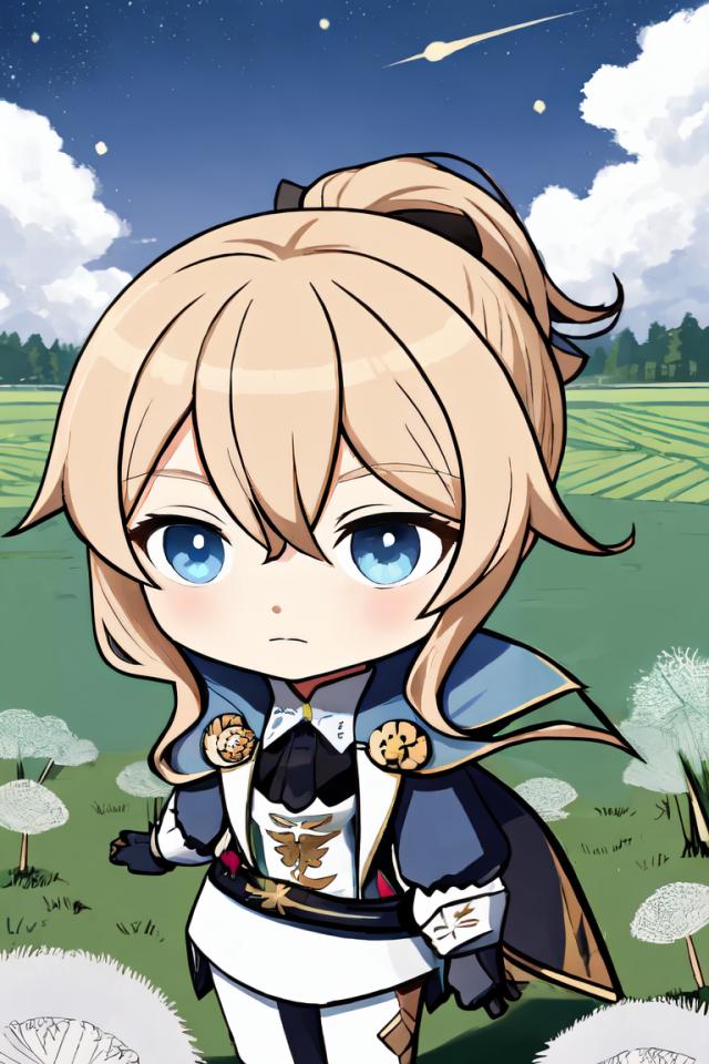 1girl, bangs, belt, black gloves, blonde hair, blue eyes, blue sky, bow, capelet, chibi, cloud, cloudy sky, full body, gloves, grass, hair between eyes, hair bow, hair ribbon, horizon, light brown hair, long hair, long sleeves, looking at viewer, mushroom , night sky, outdoors, pants, ponytail, ribbon, sidelocks, sky, solo, standing, star (sky), starry sky, white pants
