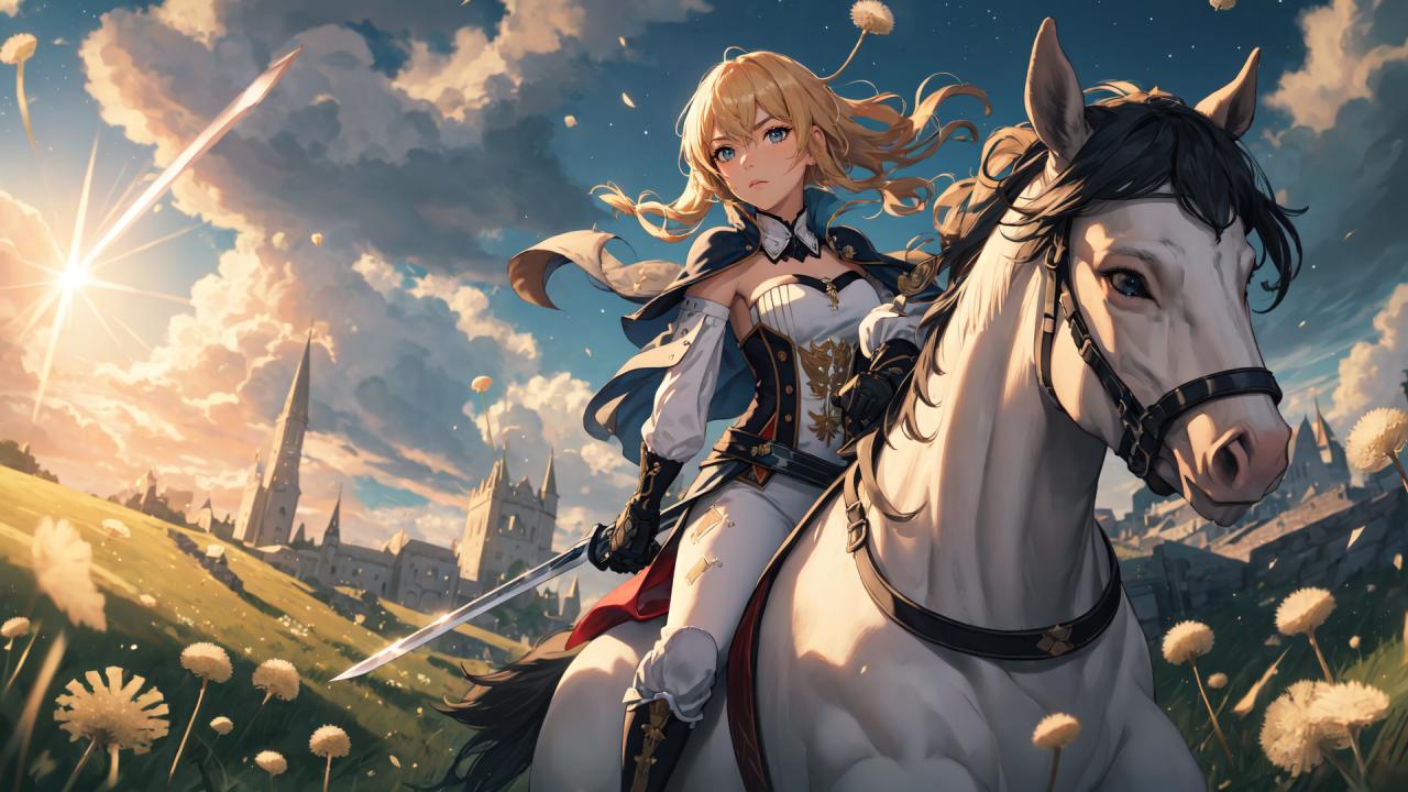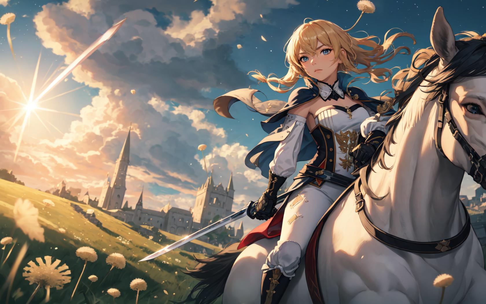 1girl, bangs, black gloves, blonde hair, blue capelet, blue eyes, boots, bow, breasts, capelet, cleavage, closed mouth, cloud, cloudy sky, corset, dandelion , day, flower, gloves, grass, hair between eyes, hair bow, holding, holding sword, holding weapon, horse, horseback riding, long hair, medium breasts, outdoors, pants, petals, ponytail, reins, riding, sidelocks, sky, solo, strapless, sun, sword, tight, tight pants, weapon, white pants