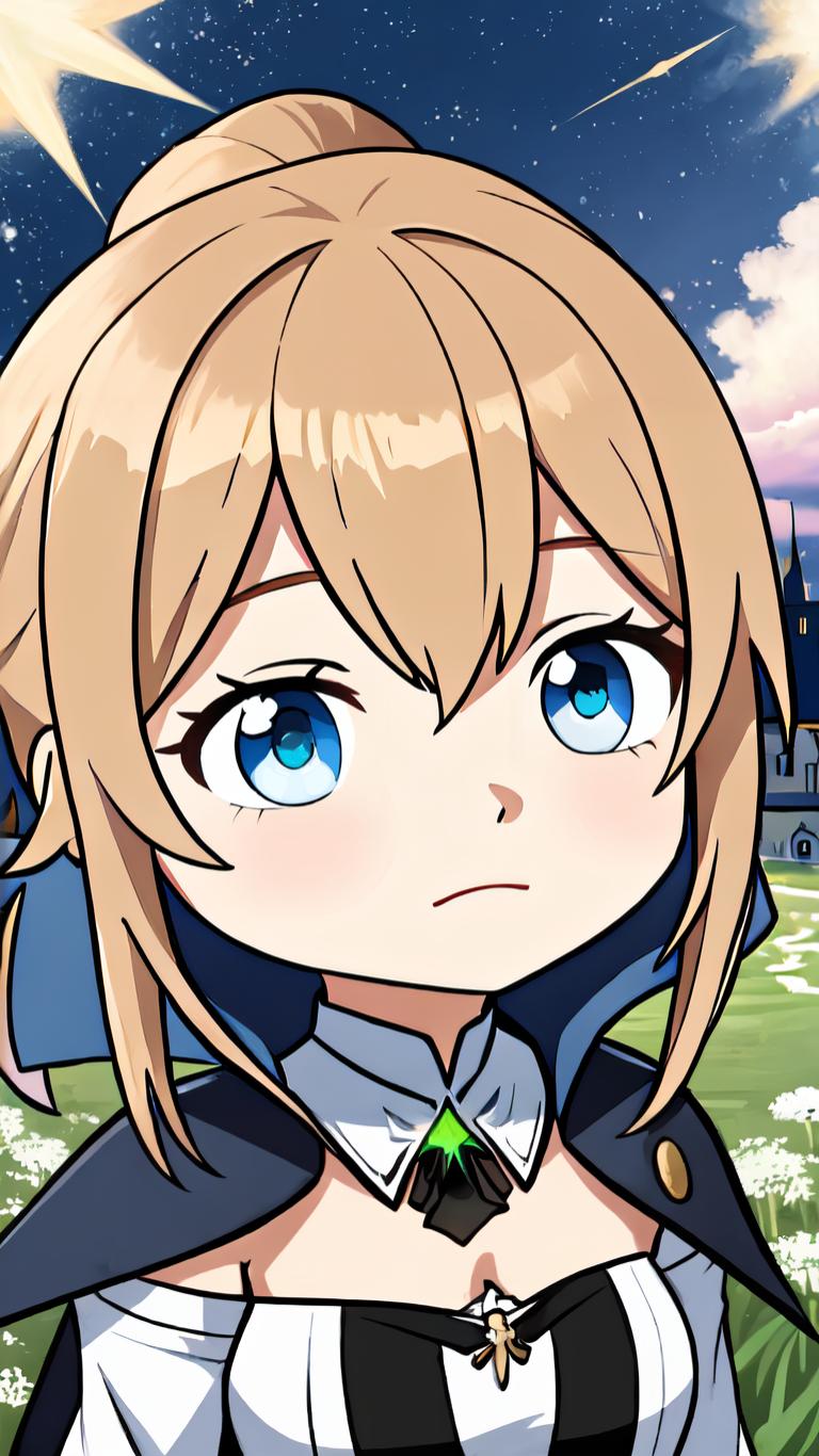 1girl, 3d background , bangs, blue eyes, bow, capelet, cleavage, cloud, cloudy sky, detached collar, detached sleeves, hair between eyes, hair bow, hair ribbon, light brown hair, long hair, looking at viewer, night, night sky, ponytail, ribbon, sidelocks, sky, skyline, solo, star (sky), starry sky, strapless