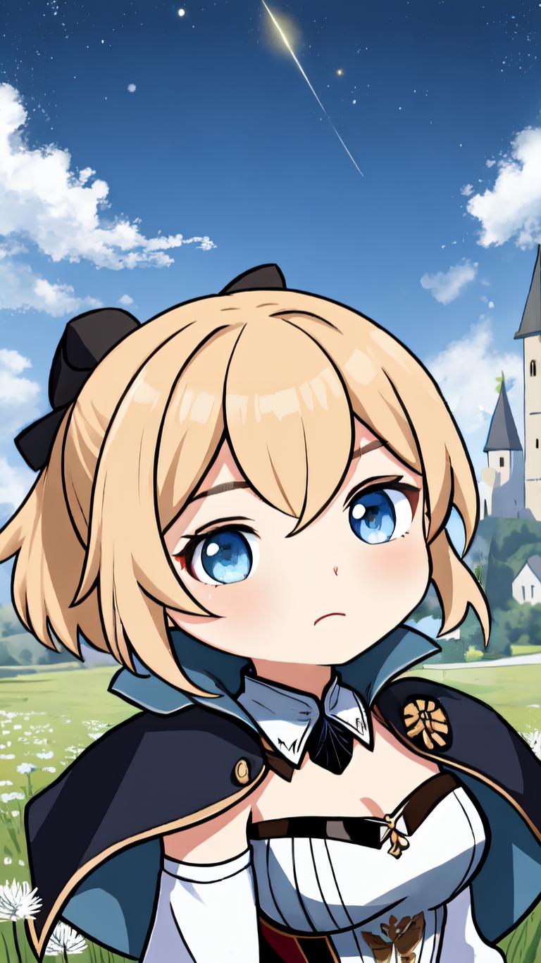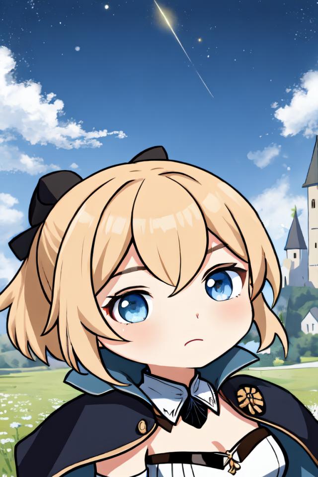 1girl, bangs, blonde hair, blue eyes, blue sky, bow, breasts, capelet, cleavage, cloud, cloudy sky, dandelion , detached collar, detached sleeves, flower, hair between eyes, hair bow, hair ribbon, light brown hair, long hair, looking at viewer, night, night sky, outdoors, ponytail, ribbon, sidelocks, sky, skyline, solo, star (sky), starry sky, strapless
