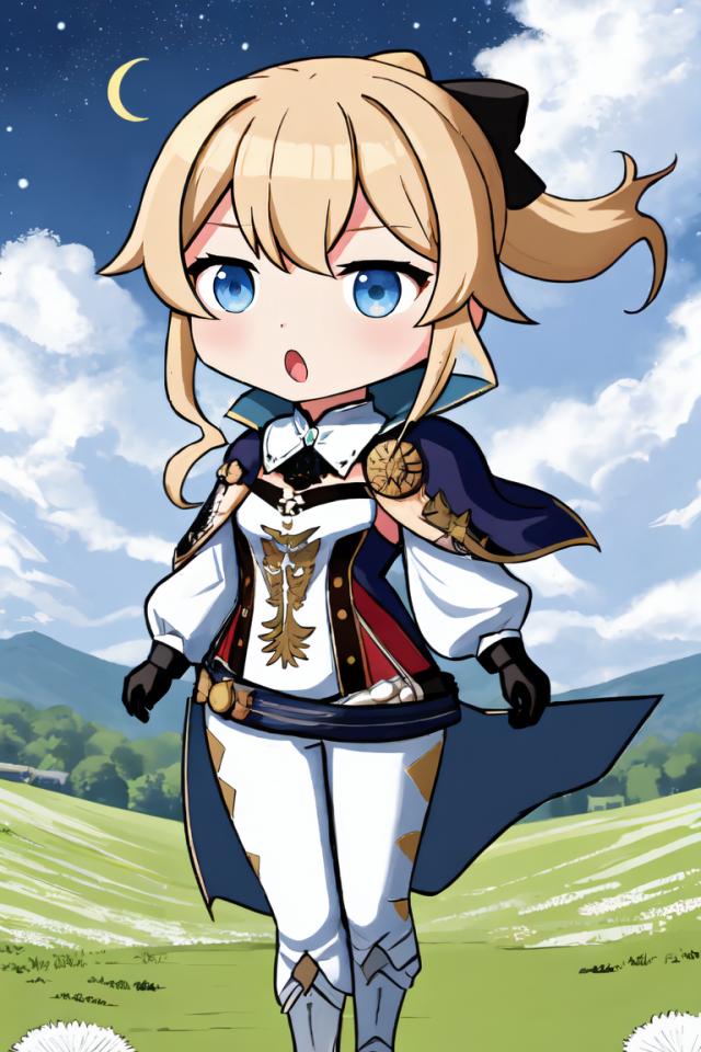 1girl, :o, bangs, black bow, black gloves, blonde hair, blue capelet, blue eyes, blue sky, blush, boots, bow, cape, capelet, chibi, cloud, crescent moon, dandelion , day, detached sleeves, flower, full body, gloves, grass, hair between eyes, hair bow, long hair, long sleeves, moon, night, night sky, outdoors, pants, ponytail, puffy long sleeves, puffy sleeves, shirt, sky, solo, standing, star (sky), starry sky, strapless, walking, white flower, white footwear, white pants, white shirt