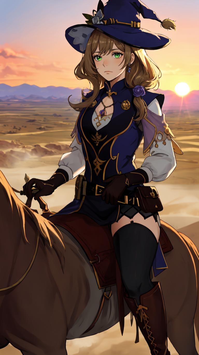 1girl, bangs, belt, black gloves, black thighhighs, boots, breasts, brown hair, capelet, cleavage, earrings, flower, gloves, green eyes, hair ornament, hat, horseback riding, jewelry, long hair, long sleeves, looking at viewer, outdoors, purple headwear, riding, rose, sidesaddle , sky, solo, sunset, thighhighs, witch, witch hat