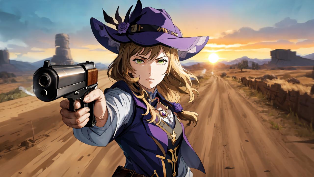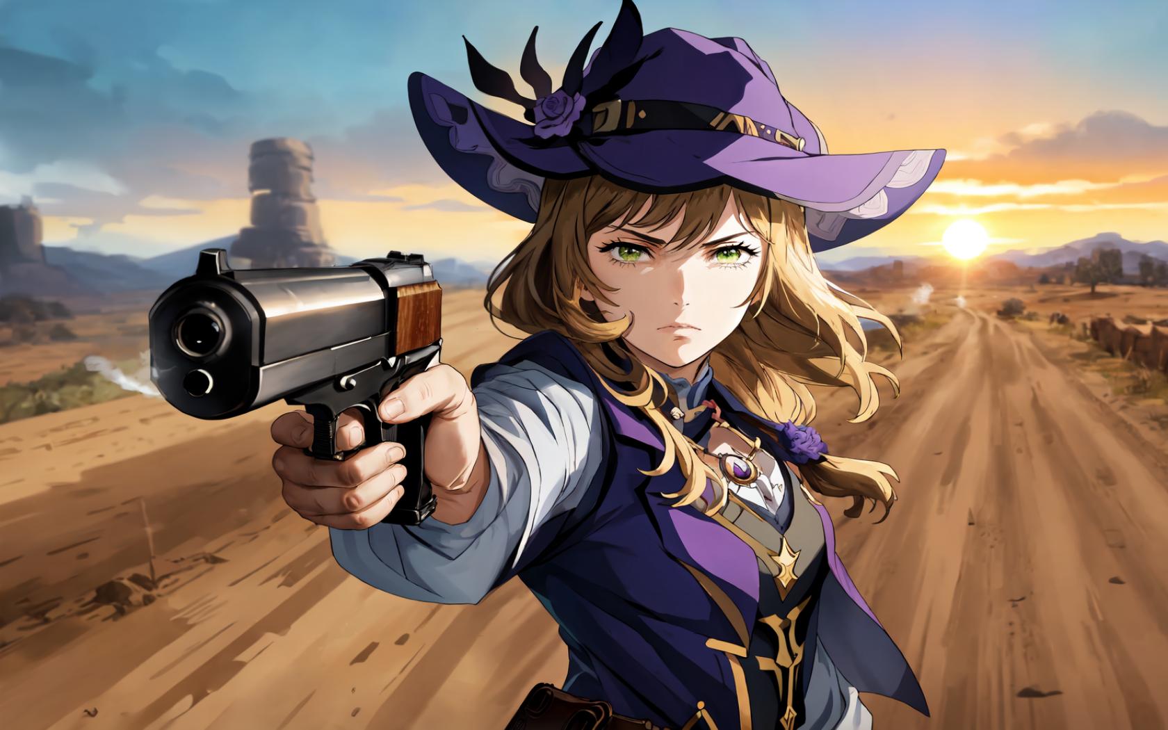 1girl, aiming at viewer, bangs, brown hair, closed mouth, desert, flower, green eyes, gun, hair ornament, handgun, hat, hat flower, holding, holding gun, holding weapon, jewelry, long hair, looking at viewer, outdoors, purple capelet , purple flower, purple headwear, purple rose, rose, serious, sky, solo, weapon, witch hat