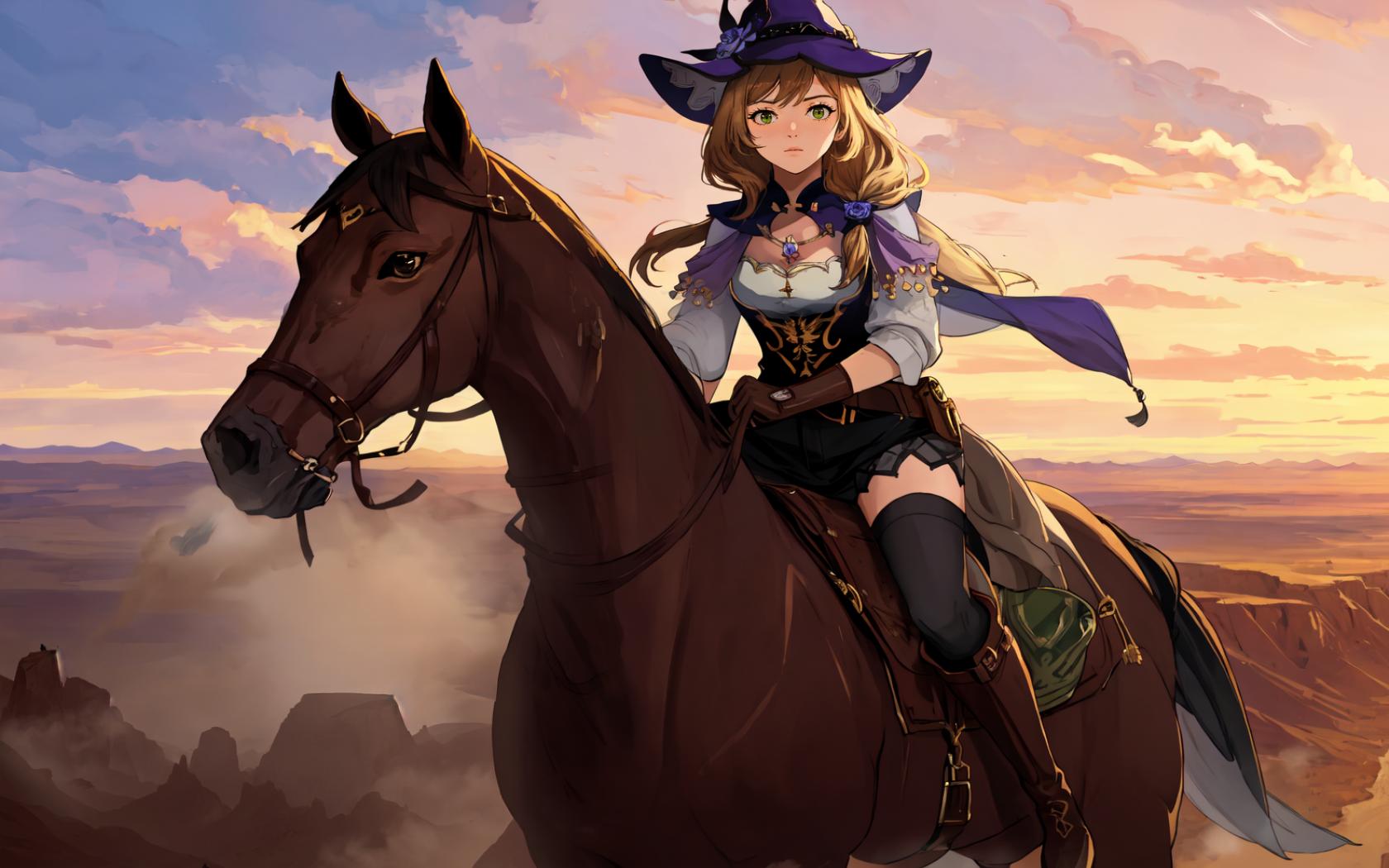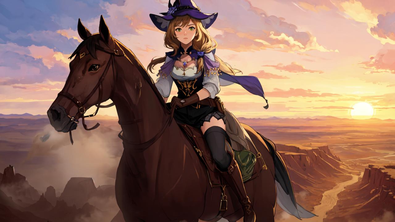 1girl, bangs, black thighhighs, boots, breasts, brown footwear, brown hair, cape, capelet, cleavage, cloud, cloudy sky, corset, flower, gloves, green eyes, hat, horse, horseback riding, jewelry, long hair, looking at viewer, medium breasts, mountain, necklace, ocean, orange sky, outdoors, purple flower, purple headwear, riding, saddle , scenery, sidesaddle, skirt, sky, solo, sun, sunset, thighhighs, twilight, white shirt, witch hat, zettai ryouiki