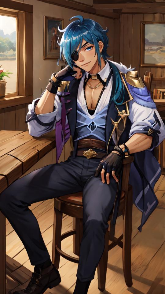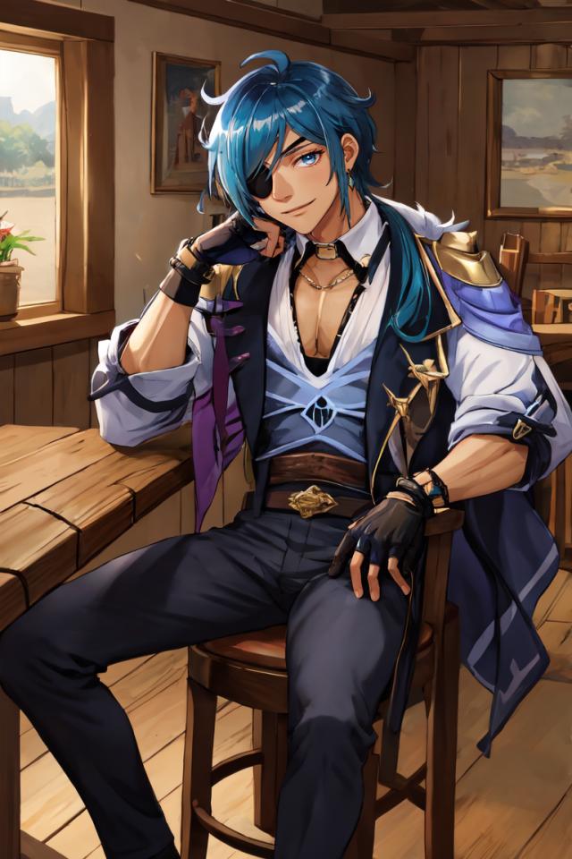| Prompt | <lora:kaiya:0.8>(manly:1.5), kaeya (genshin impact), (1boy:1.4), (male focus:1.5), (eyepatch:1.2), dark-skinned male, gloves, solo, jewelry, blue hair, earrings, (long hair:1.1), blue eyes, single earring, dark skin, bangs, black gloves, smile, fingerless gloves,