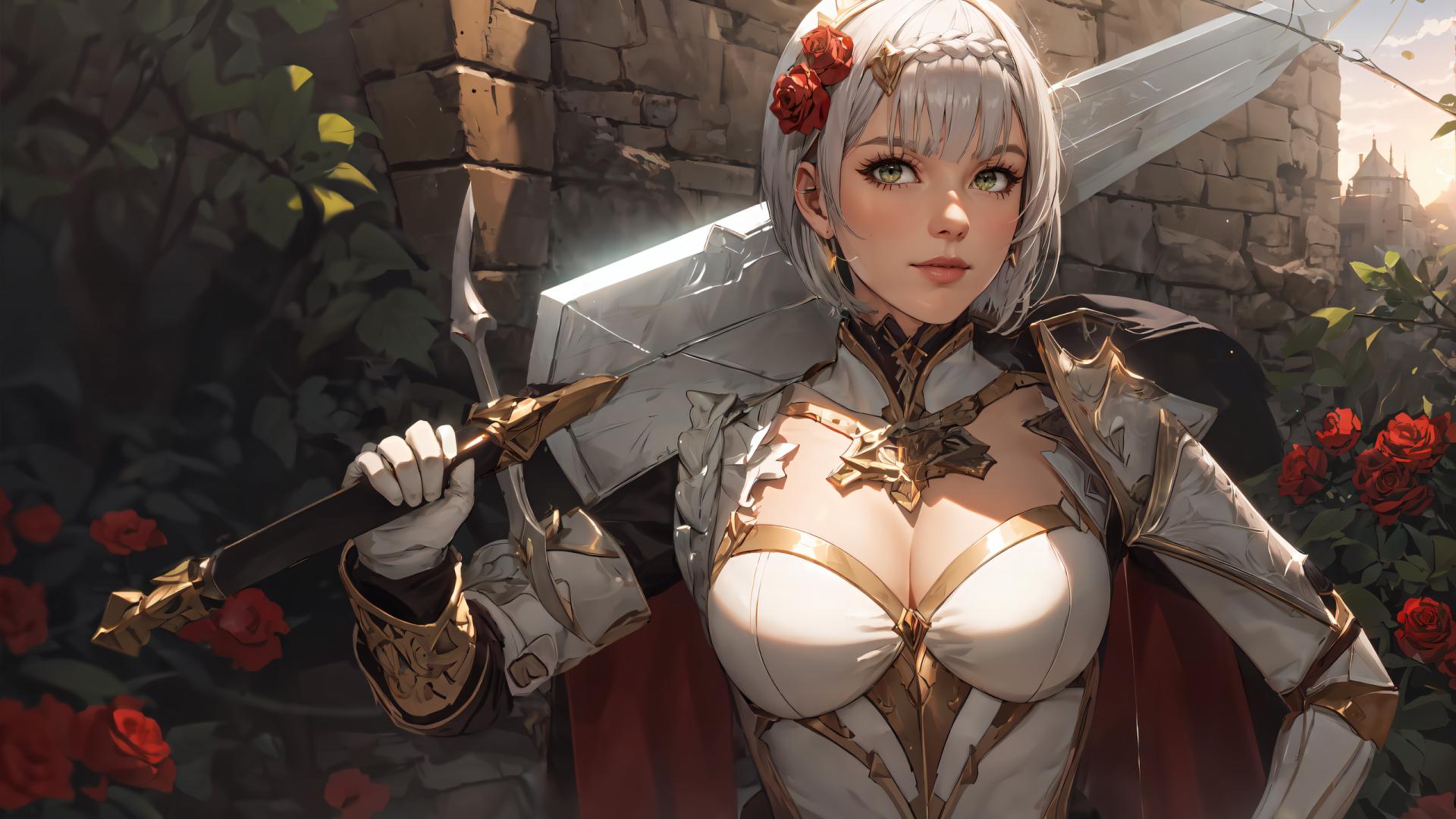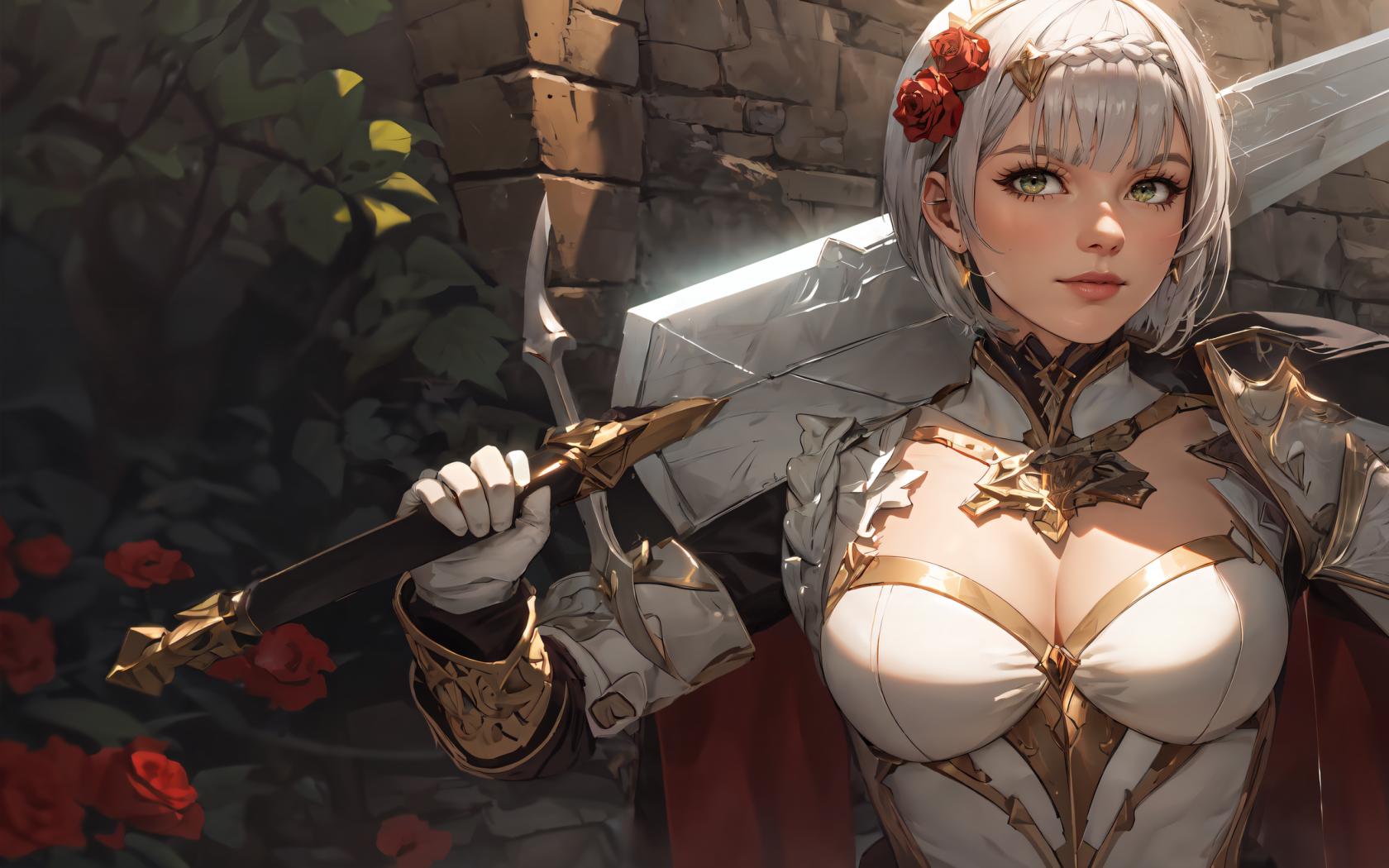 1girl, alternate costume, armor, bangs, braid, breasts, cape, cleavage, earrings, flower, gloves, greatsword , green eyes, hair flower, hair ornament, holding, holding sword, holding weapon, jewelry, large breasts, lips, looking at viewer, outdoors, over shoulder, pauldrons, red flower, red rose, rose, short hair, shoulder armor, smile, solo, sword, upper body, weapon, weapon over shoulder, white gloves, white hair