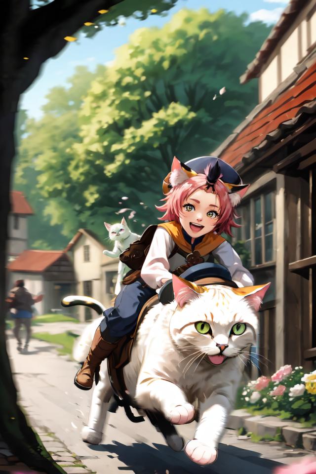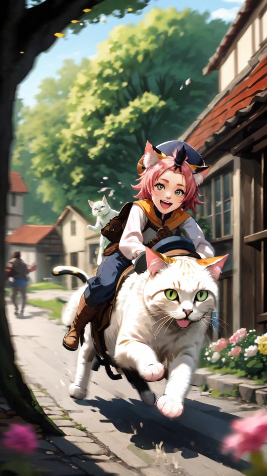 1girl, :d, animal, animal ear fluff, animal ears, bag, bangs pinned back , blurry, blurry background, blush, boots, cat, cat ears, cat girl, cat tail, flower, green eyes, hat, looking at viewer, open mouth, outdoors, pink hair, riding, short hair, smile, tail, tree