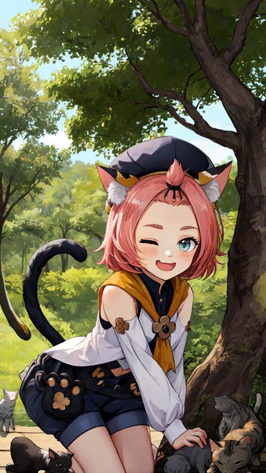 1girl, ;d, animal ear fluff, animal ears, bangs pinned back , black cat, black shorts, blush, cat, cat ears, cat girl, cat tail, day, detached sleeves, fang, forehead, green eyes, hat, kneeling, long sleeves, looking at viewer, one eye closed, open mouth, outdoors, paw print, pink hair, shirt, short hair, shorts, smile, solo, tail, thick eyebrows, tree, white sleeves