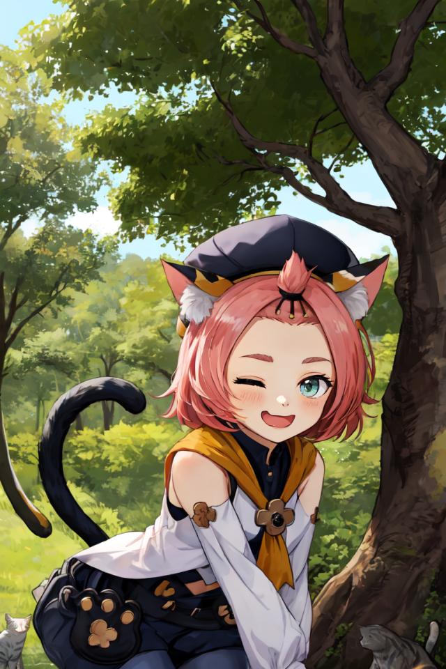 | Prompt | <lora:diona2:1>close view of dionadef,kneeled ((on a branch, atop of a tree)), <lora:moreExpressions2:0.4> =_=,wavy mouth,one eye closed, happy, ((claw pose)), cute,kawai, medieval town street background, front of a medieval wooden tavern, trees, flowers, penants, (((cats))), |