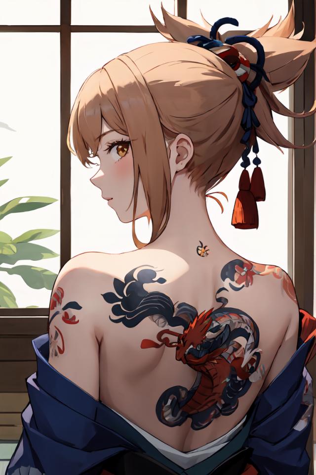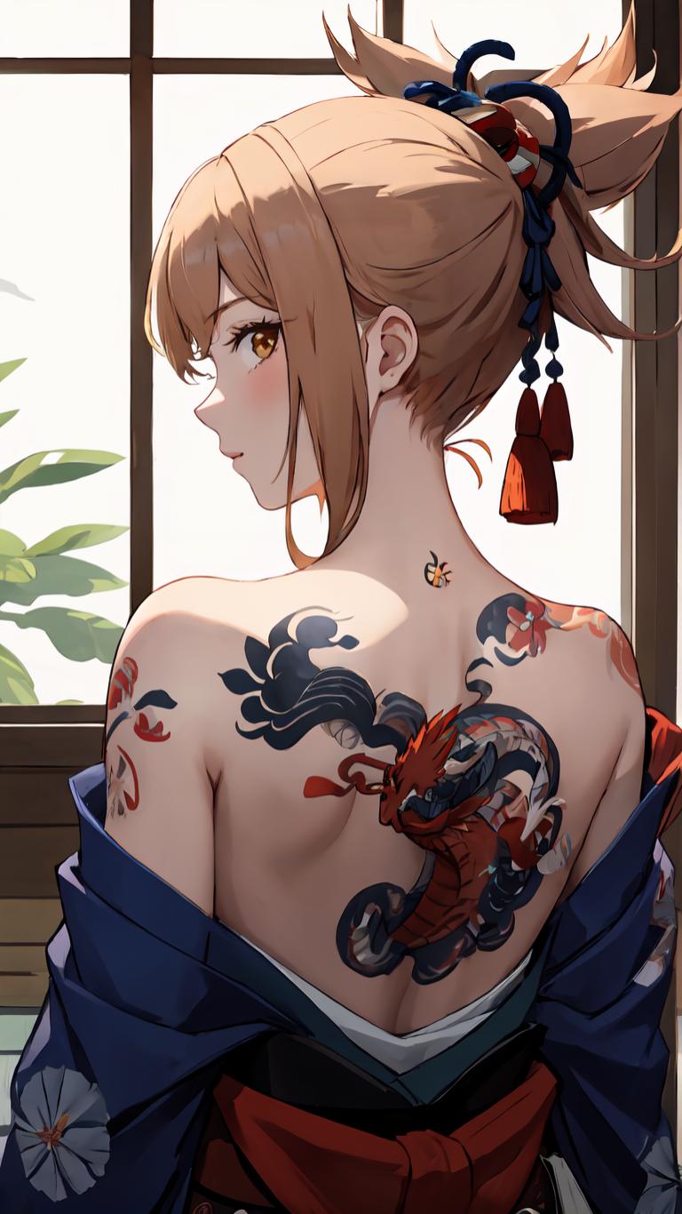 Prompt <lora:yoimiya2:0.8> yoimiyarnd, wariza, kimono,bare shoulders, (view from behind), <lora:tattoo_lora01:0.5> 1girl, eastern dragon tattoo,((back tattoo)),flowers, traditional japanese tattoo, inside traditional japanese bedroom, looking at viewer, embarassed,