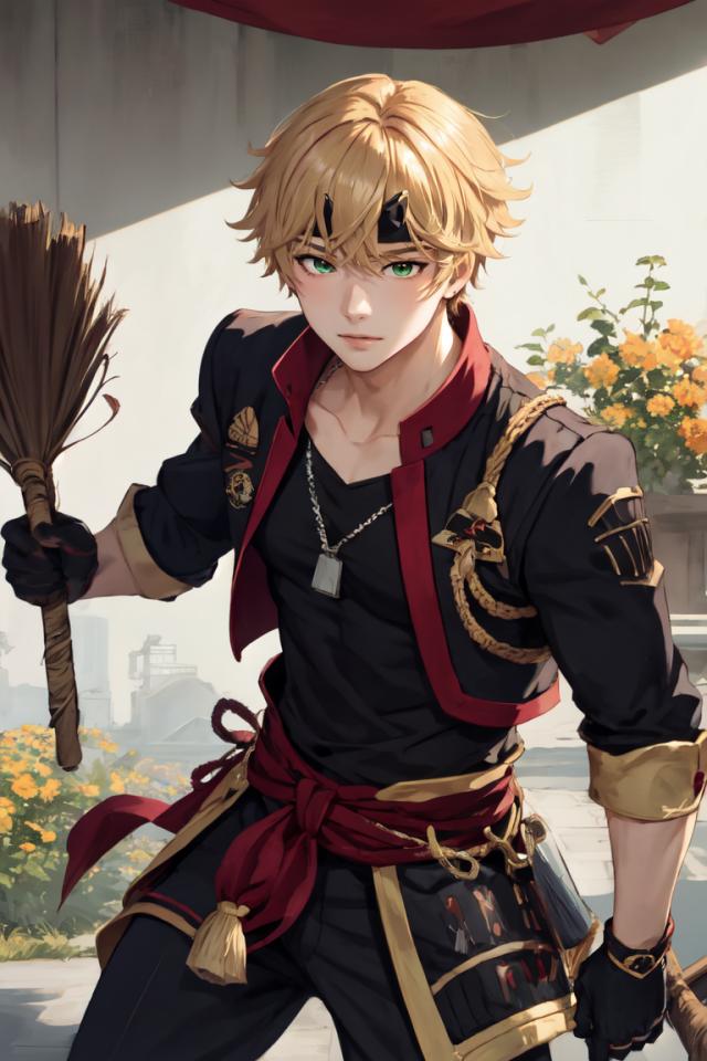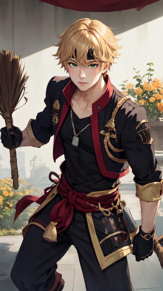 1boy, bangs, black gloves, black shirt, blonde hair, broom, closed mouth, collarbone, day, dog tags, fake horns, fingerless gloves, flower, gloves, green eyes, hair between eyes, headband, holding, horned headwear , horns, jacket, looking at viewer, male focus, open jacket, outdoors, pants, rope, shirt, solo, standing, tassel