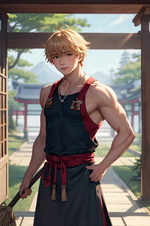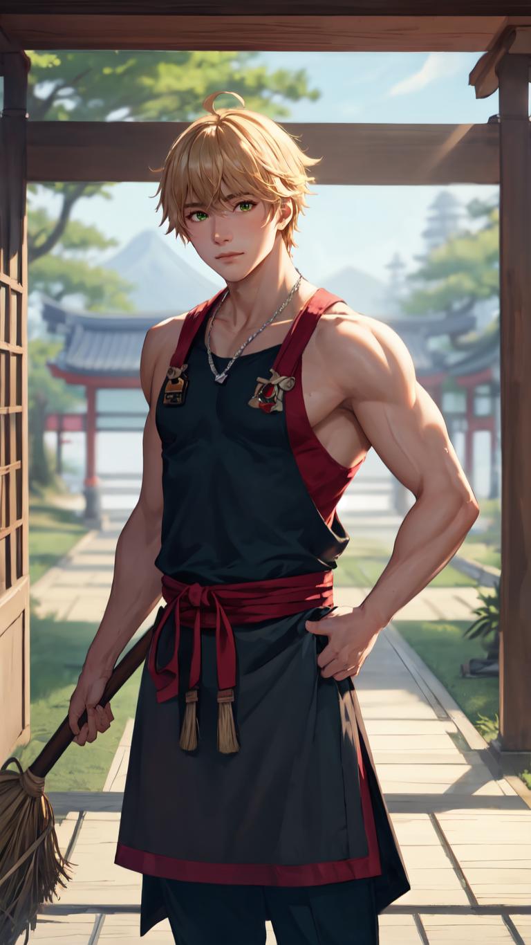 1boy, ahoge, apron, bangs, bare shoulders, black pants, blonde hair, broom, closed mouth, collarbone, day, dog tags , east asian architecture, green eyes, hand on hip, holding, jewelry, looking at viewer, male focus, muscular, necklace, outdoors, pants, pectorals, shirt, short hair, solo, standing, tank top, toned, tree