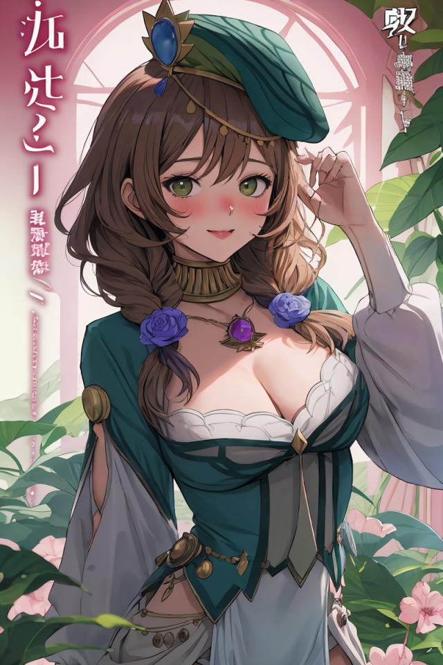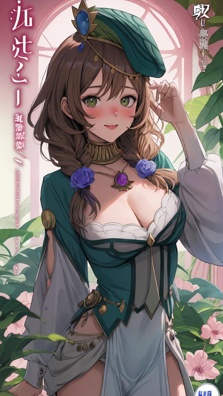 1girl, bangs, blush, braid, brown hair, cleavage, cowboy shot, dress, flower, green dress, green eyes, green headwear, hair flower, hair ornament, hair over shoulder, hand up, hat, jewelry, large breasts, long hair, long sleeves, looking at viewer, neck ring , necklace, pelvic curtain, purple flower, rose, smile, solo