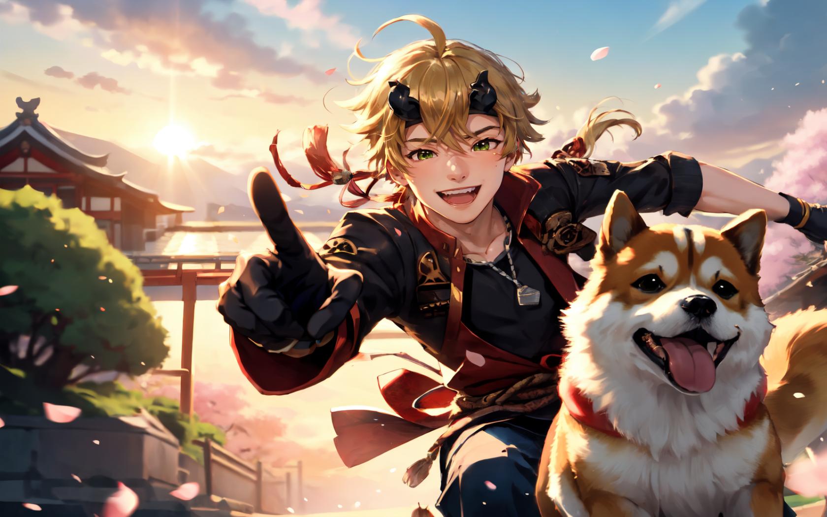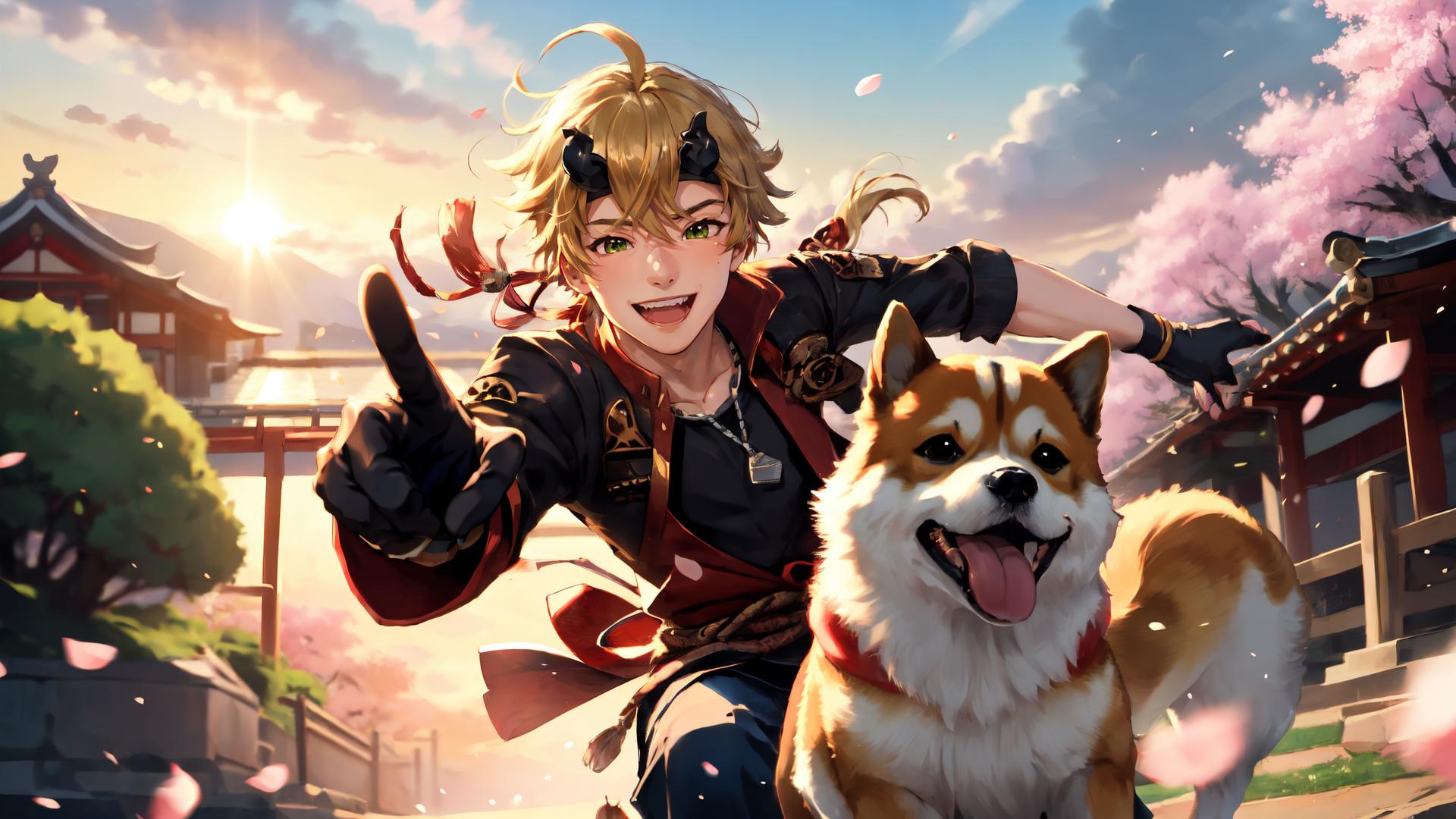 1boy, ahoge, architecture, bangs, black gloves, black shirt, blonde hair, blue pants, blue sky, building, cherry blossoms, cloud, collarbone, cowboy shot, day, dog, dog tags, east asian architecture, fake horns, fingerless gloves, floating hair, gloves, green eyes, hair between eyes, headband, horned headwear, horns, jacket, japanese clothes, long hair, looking at viewer, male focus, open jacket, open mouth, outdoors, outstretched arm, pants, petals, pointing, ponytail, rope, shiba inu , shirt, sky, sleeves rolled up, smile, solo, teeth, tongue, tree