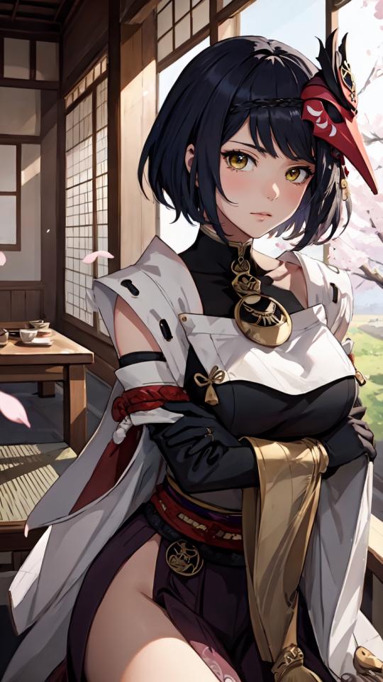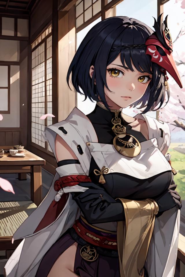 1girl, bangs, bird mask , black gloves, black hair, blush, breasts, cherry blossoms, closed mouth, cowboy shot, crossed arms, day, detached sleeves, elbow gloves, gloves, indoors, japanese clothes, large breasts, lips, looking at viewer, mask, mask on head, obi, pelvic curtain, petals, sash, short hair, sitting, solo, swept bangs, table, thighs, vision (genshin impact), wide sleeves, yellow eyes