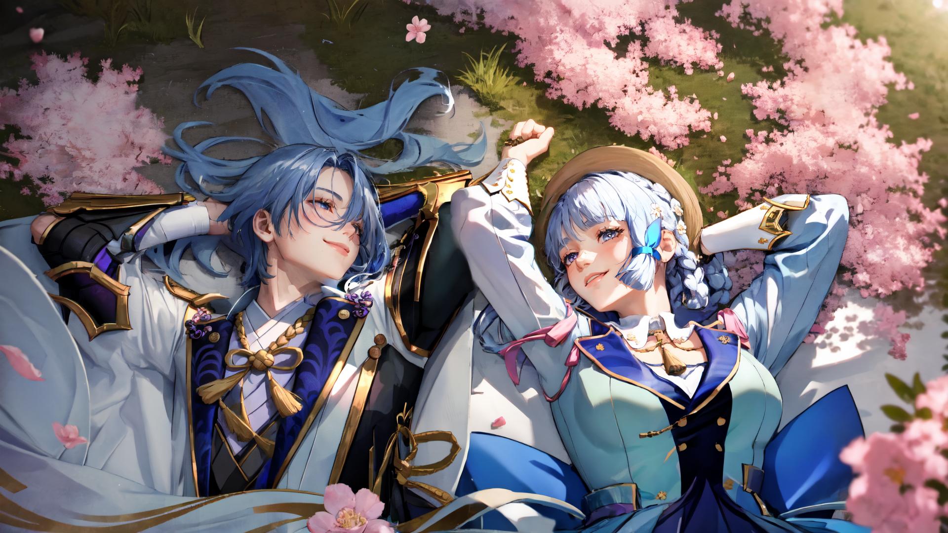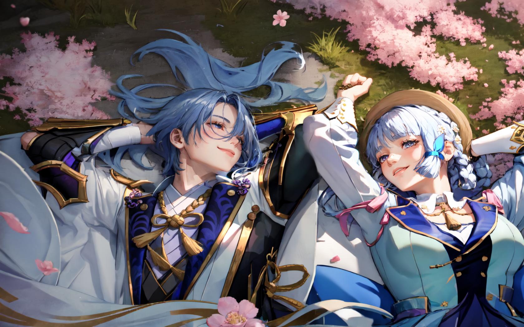 | Prompt | 1girl, 1boy,upper body,((view from above)),lying in grass, outdoors, sunset, spring, flowers,sakura blossoms, cinematic lighting, ADDCOMM <lora:ayato:0.9>kamisato ayato, 1boy, japanese armor, ((muscular,male focus)), armor, shoulder armor, tassel, solo, mole, purple eyes, bangs, japanese clothes, blue hair, mole under mouth, sode, rain, gold trim, sleeping,((hands behind head)),blue hair, ADDCOL <lora:kamisatoayaka1-000008:1>kamisatoayakaspring, white hair, smiling, happy, ((hands behind head)), |