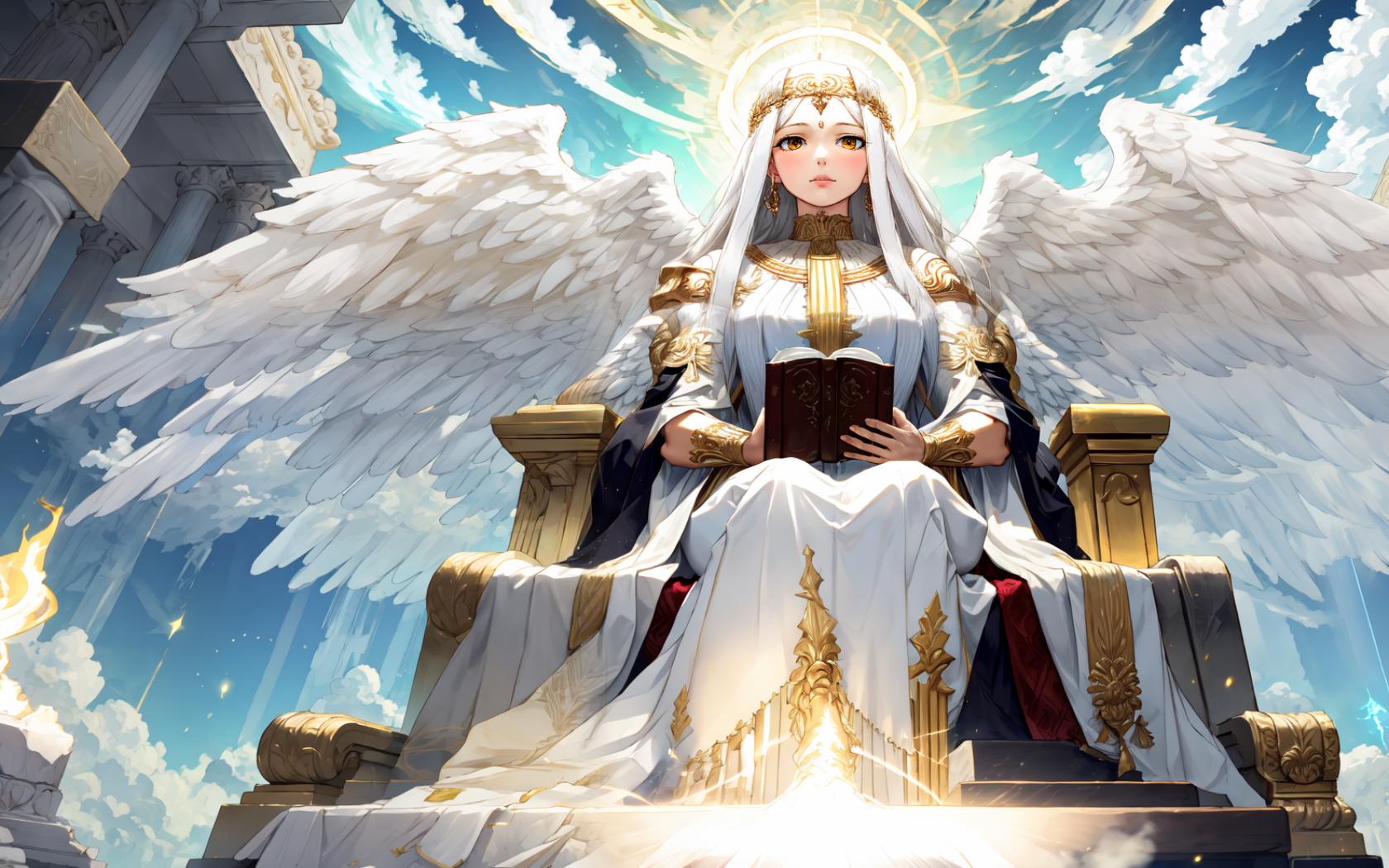 | Prompt | <lora:angel_wings_v10:0.7> angel_wings, angel, intricate, complicated ornate armored golden white lace dress, jewelry, embroidery,white golden silk, 1girl,sitting on juste throne, holding open ((sacred)) book, view from below, very long white hair, sky background, clouds,gate to heaven, ((light aura,godly)), inside greek temple, bREAK (justice godness:1.3), |
