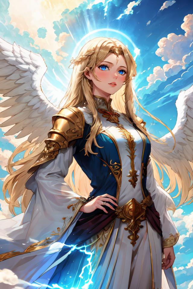 | Prompt | <lora:angel_wings_v10:0.7> angel_wings, angel, intricate, complicated ornate armored golden white lace dress, jewelry, embroidery,white golden silk, 1girl,heroic pose,proud, confident, ((deep intensive benevolent glance)), very long blonde hair,blue eyes,cute, sky background, clouds, ((light aura,godly)), bREAK (romantic fantasy:1.4), <lora:lora_perfecteyes_v1_from_v1_160:0.3> perfecteyes eyes |