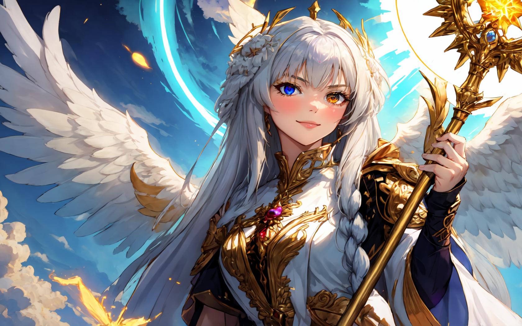 1girl, angel wings, bangs, blue eyes, blue sky, blush, braid, breasts, closed mouth, cloud, day, dress, earrings, feathered wings, gold trim, hair intakes, hair ornament, heterochromia, holding, holding staff, jewelry, long hair, long sleeves, looking at viewer, medium breasts, sky, smile, solo, staff, upper body, white dress, white hair, white wings , wide sleeves, wings, yellow eyes
