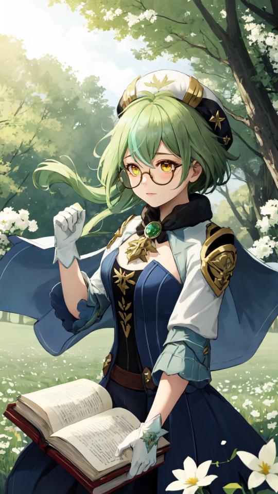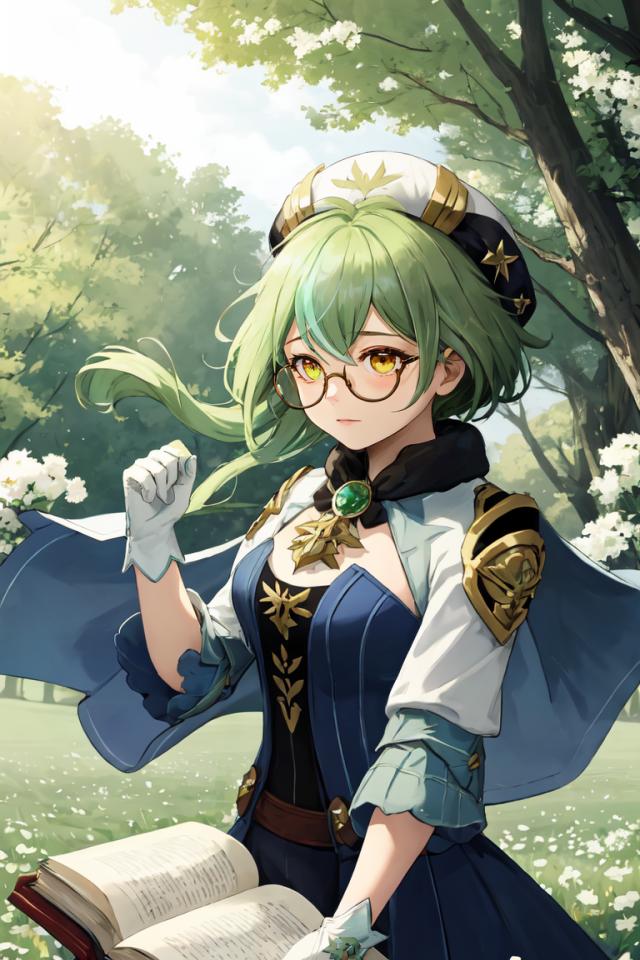 1girl, bangs, beret, blue dress, blush, book, breasts, brooch, capelet, closed mouth, day, dress, floating hair, flower, glasses, gloves, gold trim, grass, green hair, hair between eyes, hand up, hat, holding, holding book, long hair, long sleeves, open book, outdoors, semi-rimless eyewear, sidelocks, sitting, solo, sunlight, tree, vision (genshin impact) , white flower, white gloves, white headwear, yellow eyes