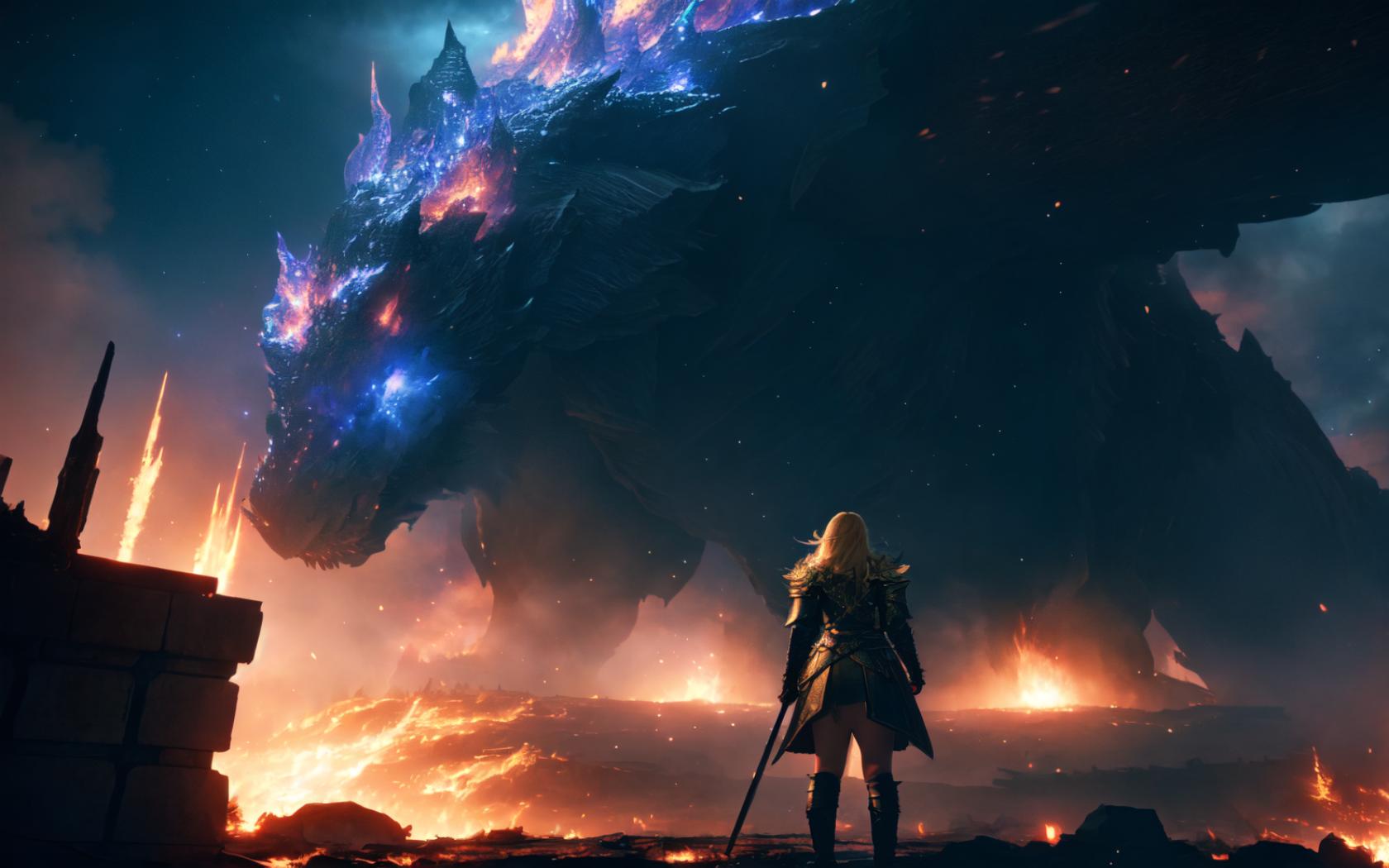 1girl, 1other, armor, blonde hair, boots, castle, cloud, dragon, embers, facing away, fantasy, fire, from behind, glowing, holding, long hair, molten rock , night, night sky, outdoors, scenery, sheath, sheathed, sky, standing, star (sky), starry sky, sword, tree, weapon
