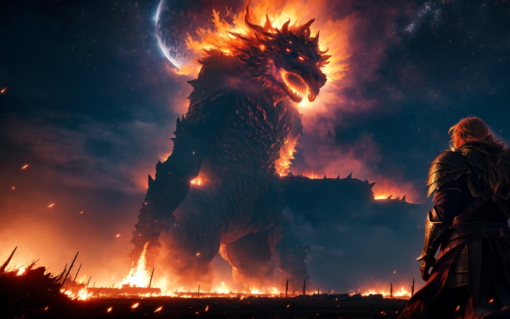 1boy, 1other, armor, embers , fire, from behind, gauntlets, giant, glowing, glowing eyes, male focus, moon, night, night sky, open mouth, outdoors, red eyes, sharp teeth, shoulder armor, sky, standing, star (sky), starry sky, sword, teeth, weapon