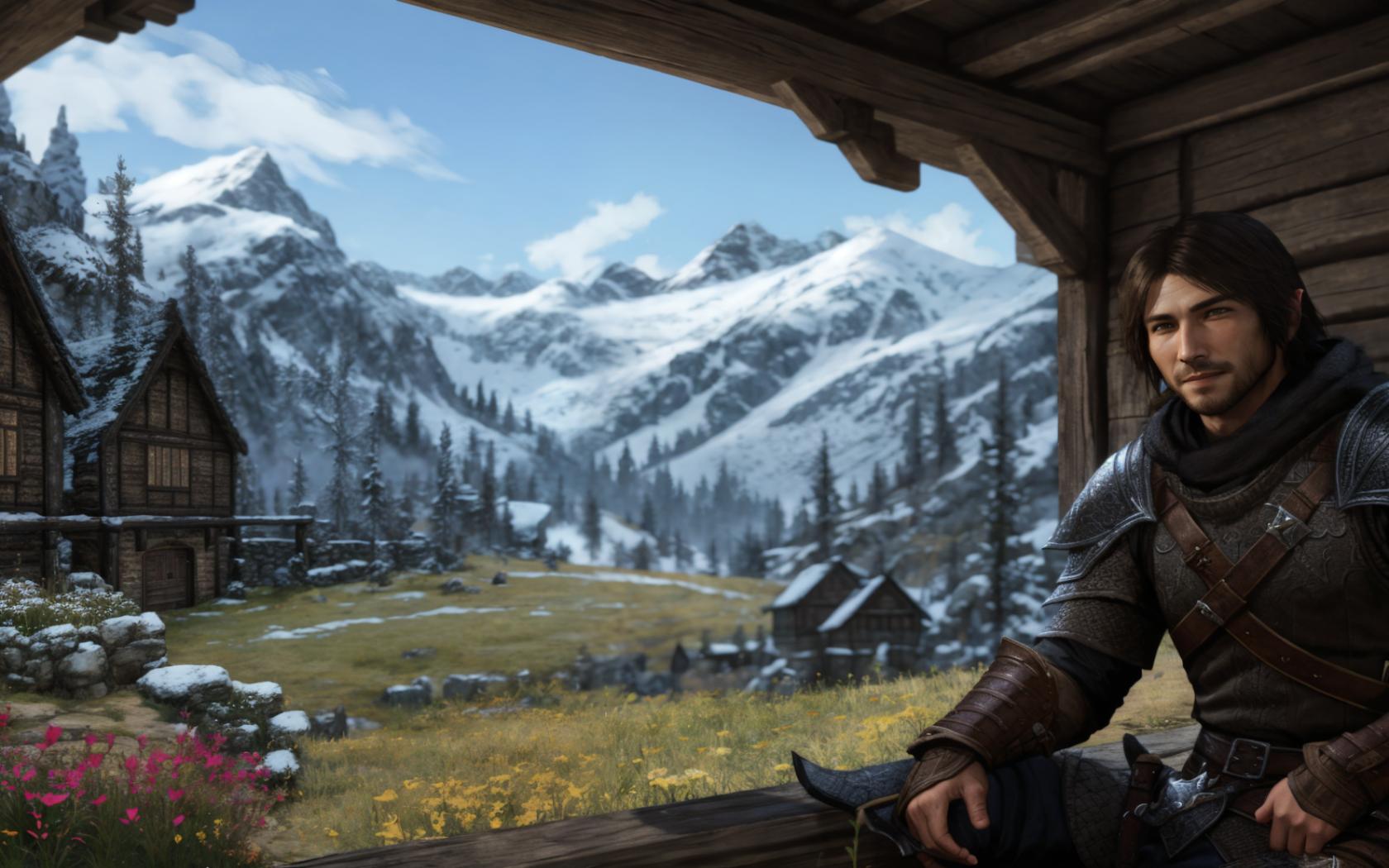 1boy, armor, beard, black hair, blue sky, brown eyes, brown hair, chainmail, cloud, day, facial hair, flower, grass, house, knife, male focus, mountain, outdoors, pauldrons, pine tree , rock, scenery, sheath, sheathed, short hair, shoulder armor, sitting, sky, snow, solo, sword, tree, vambraces, weapon