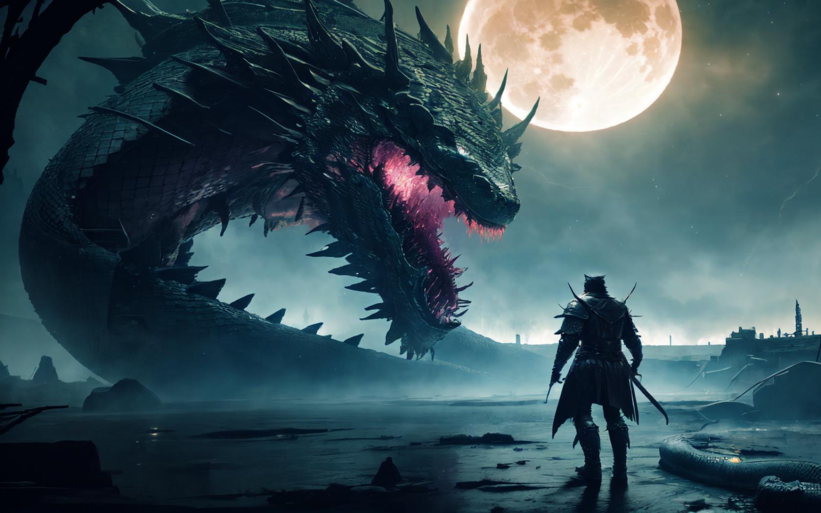 1boy, 1other, ambiguous gender , armor, cloud, cloudy sky, dragon, from behind, full moon, helmet, holding, holding sword, holding weapon, horns, moon, night, night sky, open mouth, outdoors, scenery, sharp teeth, sheath, sky, standing, sword, teeth, water, weapon, weapon on back