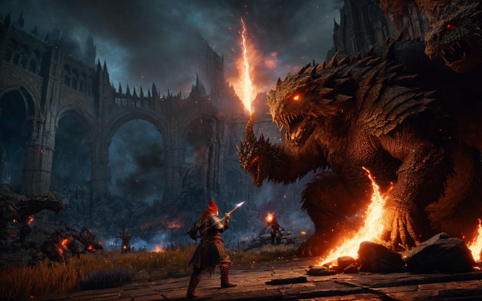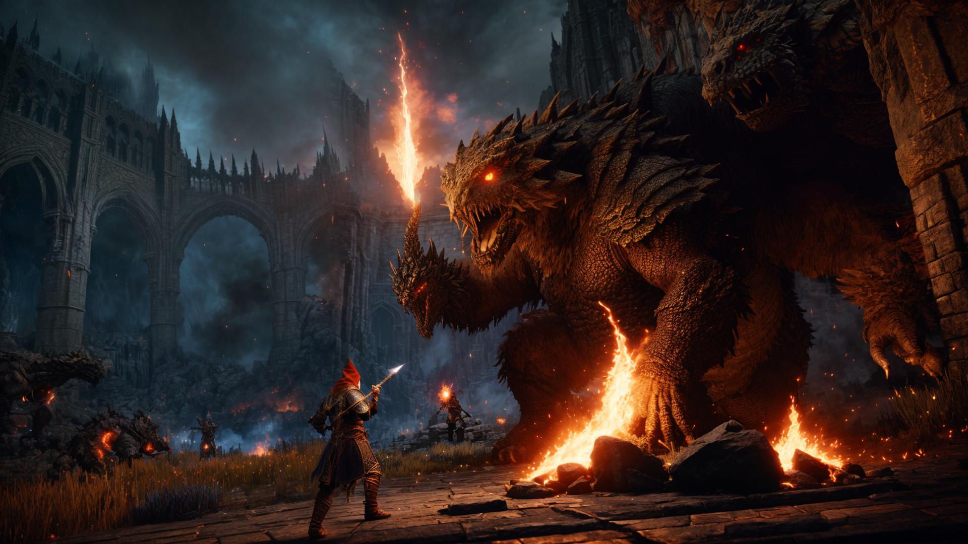 BREAK fighting giant armored monster, BREAK dynamic, motion blur, outdoors, (bg3:1.2), eldenring style scenery, (realistic epic rpg:1.3), <lora:woafu_rpgstyle:0.8> |
