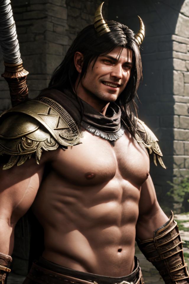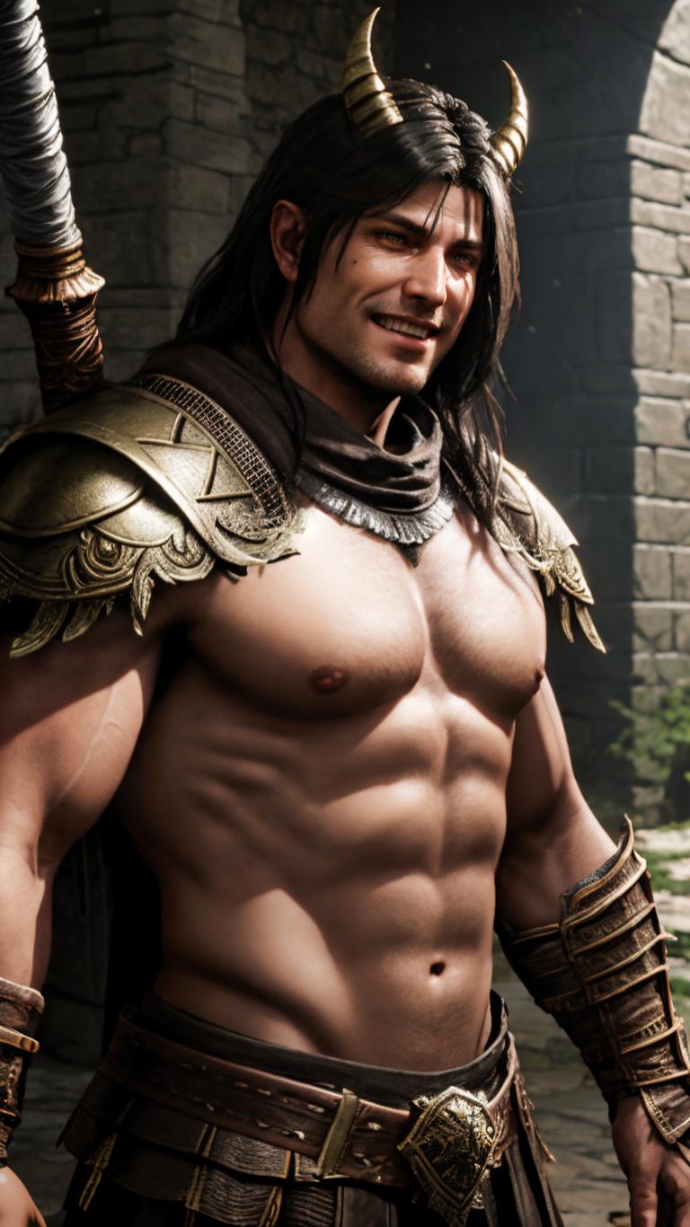 | Prompt | close view of male barbarian, well worn leather armor,