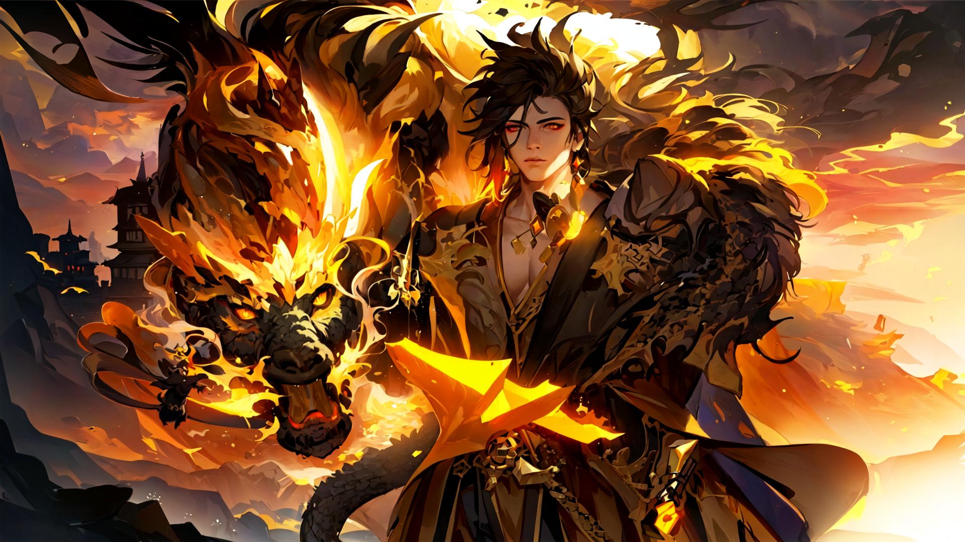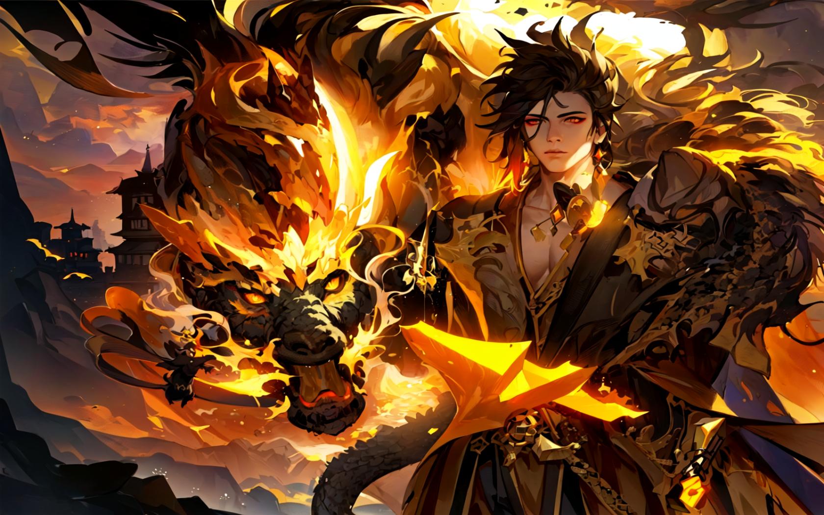 | Prompt | (highly detailed:1.5), (realistic:1.7),octane render,(1boy:1.4), (epic, dark fantasy art:1.8), (apocalyptic art:1.4), (end of the world), (perfect artwork), best quality,sharp focus,(8k), (4k),(Masterpiece), (Best Quality), fantasy, extremely detailed, intricate, hyper detailed, (perfect face), illustration,soft lighting, Ultra detailed fantasy environment, clearly worked out detail, intricate, cinematic,(depth of field), ( dramatic lighting:1.2), (black, brown, yellow and orange theme), <lora:Zhongli_Hard:1.2>, zhongli \(genshin impact\),(male focus), sunset,clouds, mist, (looking at viewer), (giant black and orange chinese mythical dragon background), dark clouds, (meteors), rock shards, mountains, |