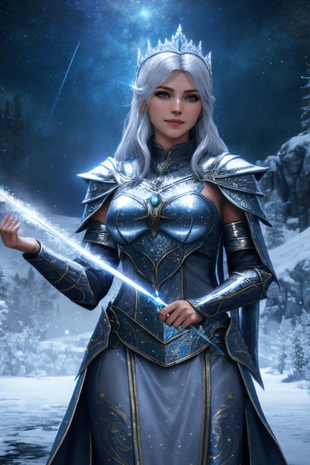 1girl, armor, armored dress , blue dress, breastplate, breasts, cape, crown, dress, grey eyes, holding, holding weapon, lips, long hair, looking at viewer, night, outdoors, realistic, sky, smile, snow, solo, standing, star (sky), starry sky, sword, weapon, white hair
