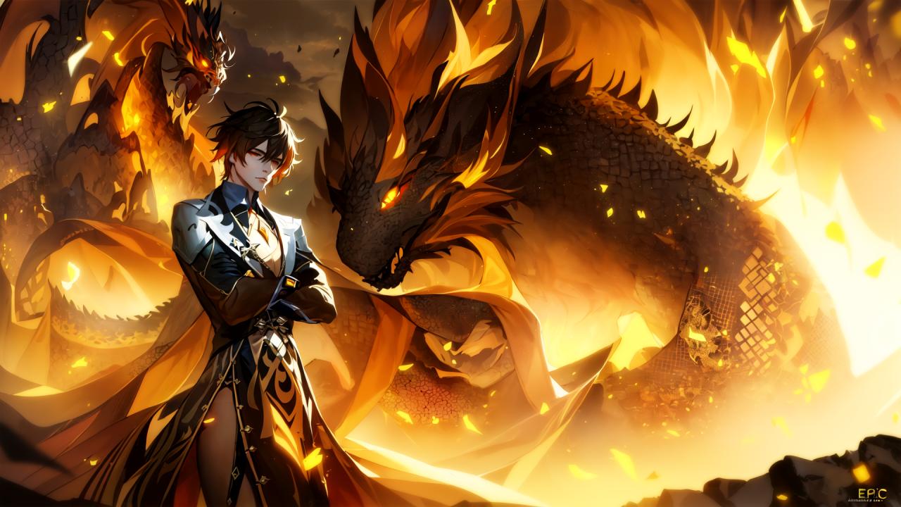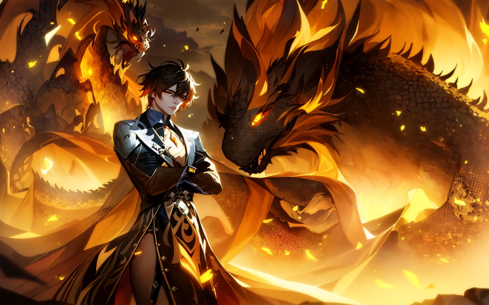 | Prompt | (highly detailed:1.5), (realistic:1.7),octane render,(1boy:1.4), (epic, dark fantasy art:1.8), (apocalyptic art:1.4), (end of the world), (perfect artwork), best quality,sharp focus,(8k), (4k),(Masterpiece), (Best Quality), fantasy, extremely detailed, intricate, hyper detailed, (perfect face), illustration,soft lighting, Ultra detailed fantasy environment, clearly worked out detail, intricate, cinematic,(depth of field), ( dramatic lighting:1.2), (black, brown, yellow and orange theme), <lora:Zhongli_Hard:1.2>, zhongli \(genshin impact\),(male focus), sunset,clouds, mist, (looking at viewer),crossed arms, (giant black and orange chinese mythical dragon background), dark clouds, (meteors), rock shards, mountains, |