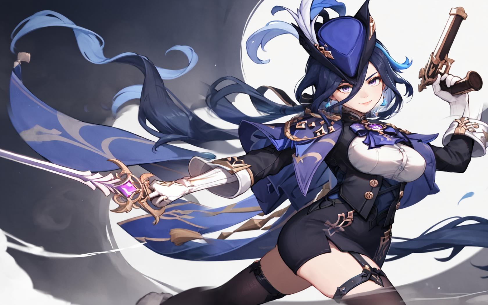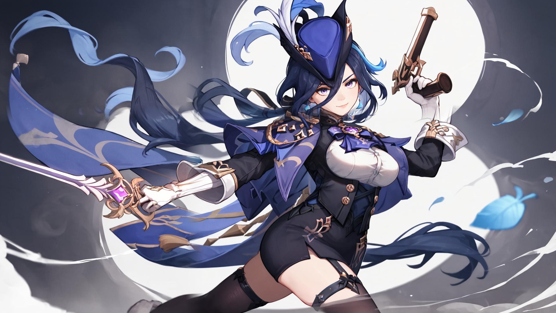 Prompt score_9, score_8_up, score_7_up, score_6_up, 1dk,portrait,close up,side view,three quarter view, <lora:clorinde_pony:0.8>1girl,clorinde_\(genshin_impact\),tricorne,white_gloves,large_breasts,white_shirt,epaulettes,blue_hat,hat_feather,blue_cape,black_skirt,thigh_strap,(black_pantyhose),pencil_skirt, ((eye lighting))), 43stl1ght1ng, low light, dramatic lighting, darkness,((smoke)), proud, confident, light malicious smile, holding sword, holding gun, dynamic pose, <lora:43stl1ght1ngXLP2:0.9> <lora:1dkXLP:0.1>