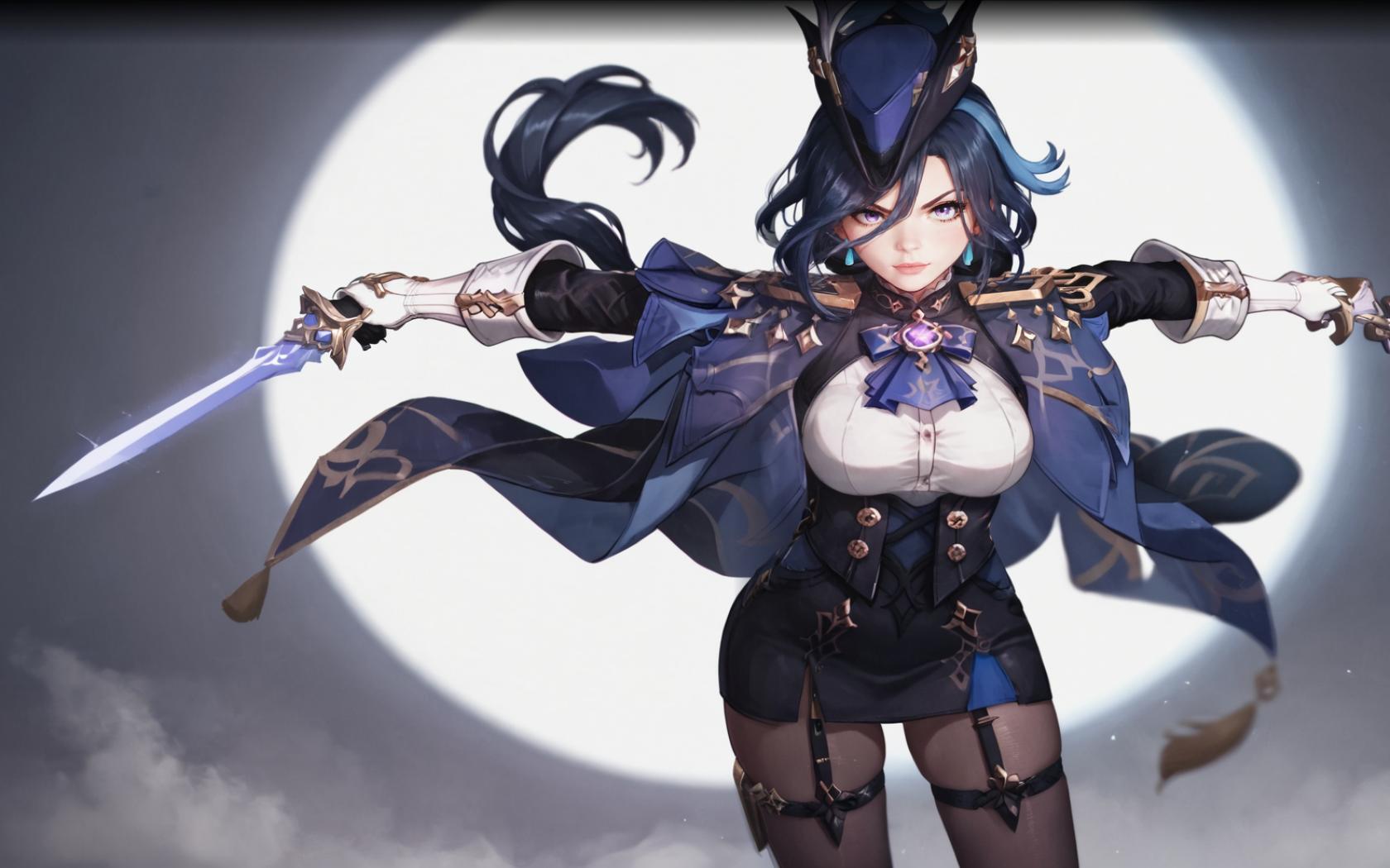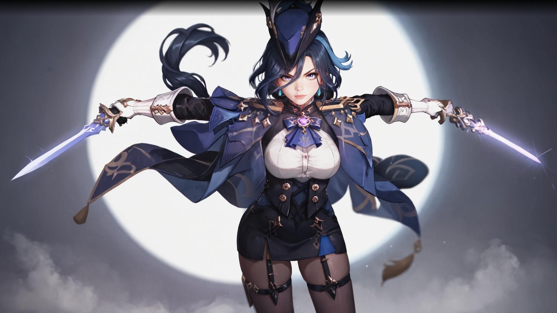 | Prompt | score_9, score_8_up, score_7_up, score_6_up, <lora:clorinde_pony:0.8>1girl,clorinde_\(genshin_impact\),tricorne,white_gloves,large_breasts,white_shirt,epaulettes,blue_hat,hat_feather,blue_cape,black_skirt,thigh_strap,(black_pantyhose),pencil_skirt, 43stl1ght1ng, low light, dramatic lighting, darkness,eye lighting, proud, confident, light evil smile, angry, agressive, holding sword, (dual wielding), (fighting stance,dynamic pose,motion blur, depth of field), epic heroic fantasy, full moon background, mist, lightnings, <lora:43stl1ght1ngXLP2:0.9> <lora:1dkXLP:0.3> 1dk |