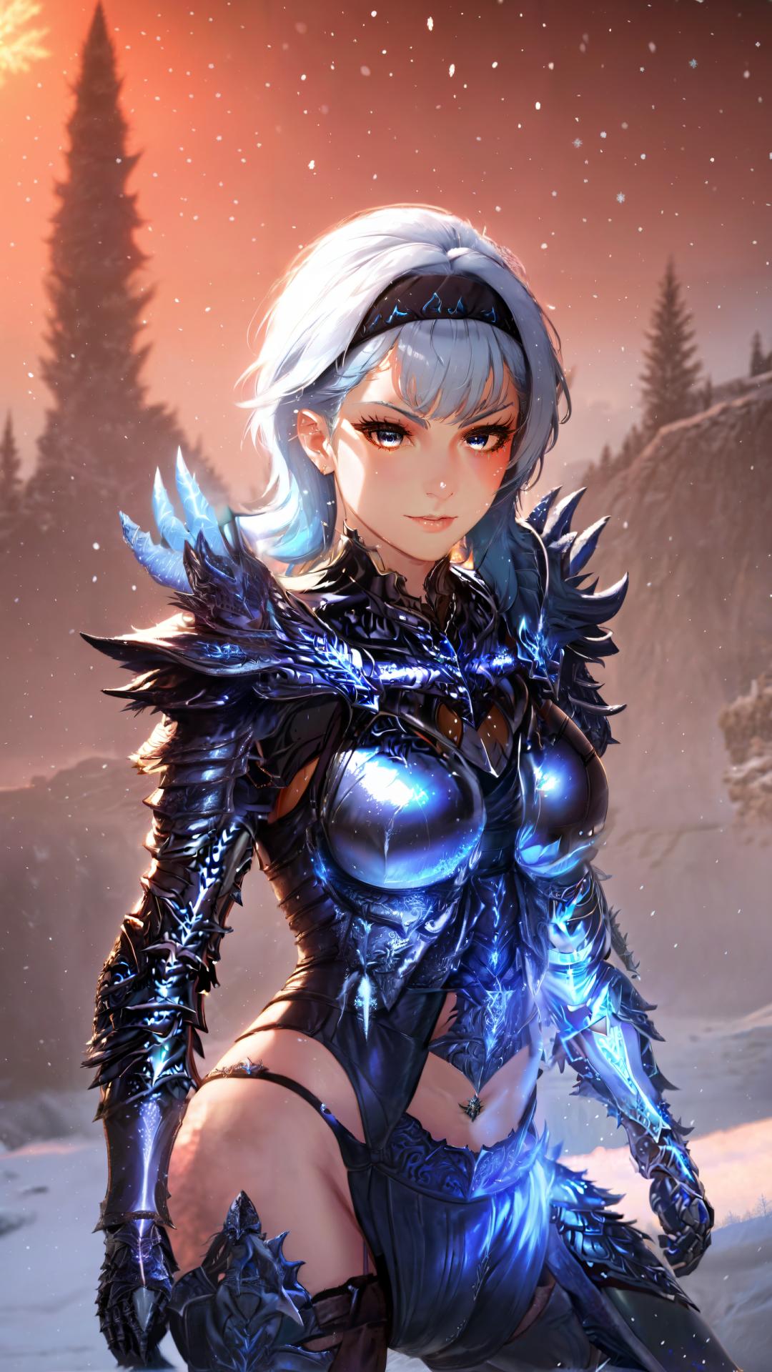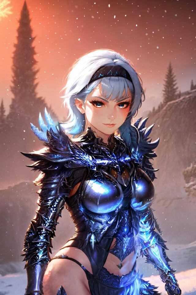 | Prompt | (3ula),wearing daedric-outfit, (shiny glowing) ((ornate)) intricate blue armor, hair ornament,black hairband,jewelry, stomach cutout, armored thighhighs, proud, confident, looking at viewer, heroic pose, frost aura, glowing blue aura, snow, snowflakes, scenery, sunset, <lora:woafu_outfitify_v103:0.8> <lora:woafu_3ula:0.8> <lora:woafu_eldenringstyle_sdxl:1> |