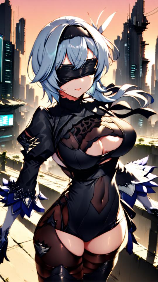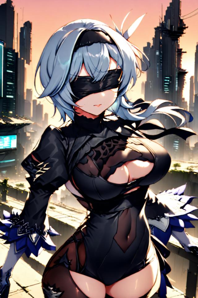 | Prompt | 3eula,(wearing 2bnier-outfit:1.1), blindfold, futuristic city background, sunset, <lora:woafu_outfitify_v103:1> <lora:woafu_3ula:0.6> <lora:Realistic000003_1_2.5DAnime_0.05_Merge1:0.5> |