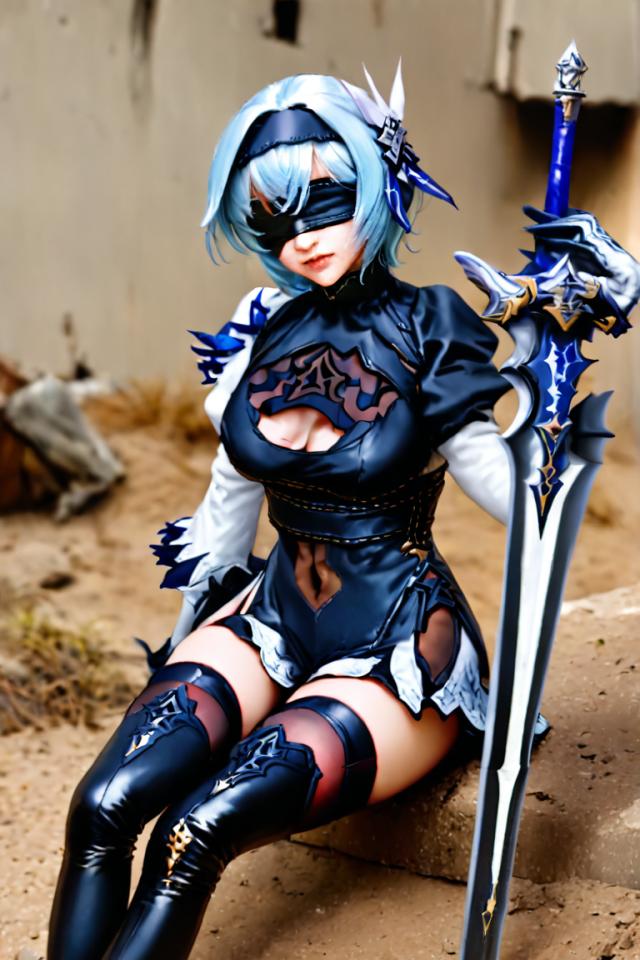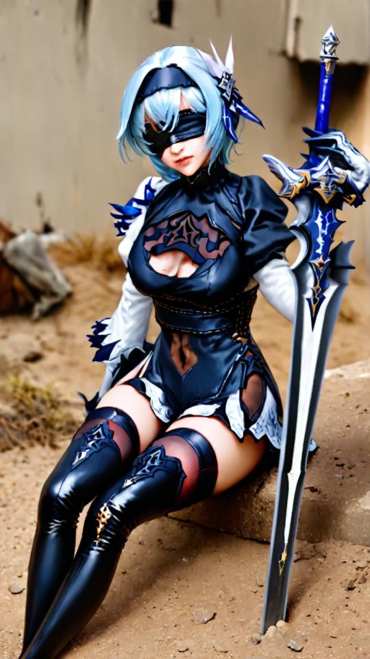 1girl, bangs, black blindfold, black dress, black footwear, black gloves, black hairband, black thighhighs, blindfold, blue hair, blurry, blurry background, boots, breasts, cleavage, cleavage cutout, clothing cutout, cosplay, depth of field, dress, gloves, greatsword , hair ornament, hairband, holding, holding sword, holding weapon, juliet sleeves, leotard, lips, long sleeves, planted, puffy sleeves, short hair, sitting, solo, sword, thigh boots, thighhighs, thighhighs under boots, two-tone gloves, weapon, white gloves