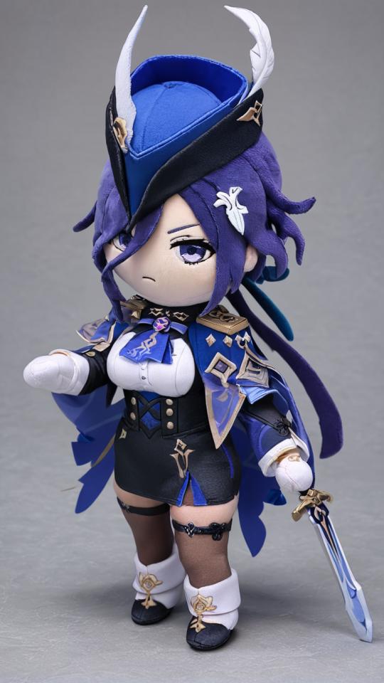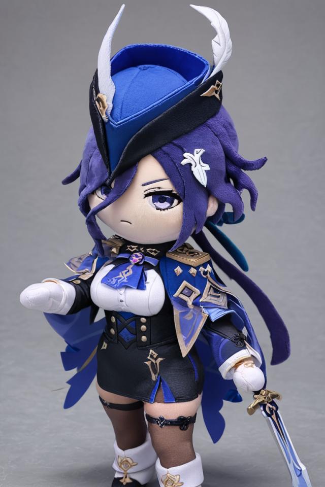| Prompt | score_9, score_8_up, score_7_up, score_6_up, source_anime, <lora:woafu_plushify_sdxl_v02:1>(plushify, chibi, character stuffed toy), <lora:clorinde_pony:0.6> 1girl,clorinde_\(genshin_impact\),tricorne,white_gloves,large_breasts,white_shirt,epaulettes,blue_hat,hat_feather,blue_cape,black_skirt,thigh_strap,black_pantyhose,pencil_skirt, holding sword, fighting stance, realistic, |
