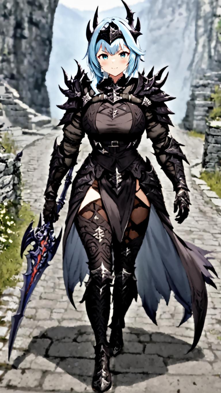 1girl, alternate costume, armor, black hairband, black thighhighs, blue eyes, blue hair, blush, boots, breasts, closed mouth, full body, gauntlets, greatsword , hair ornament, hairband, holding, holding sword, holding weapon, large breasts, looking at viewer, medium hair, outdoors, pelvic curtain, shoulder armor, smile, solo, standing, sword, thighhighs, vambraces, walking, weapon