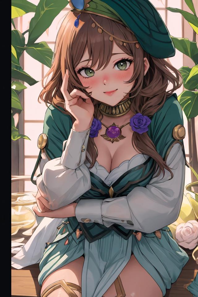1girl, alternate costume, bangs, beret, blush, brown hair, cleavage, closed mouth, dress, flower, green eyes, green headwear, hair flower, hair ornament, hair over shoulder, hand up, hat, indoors, jewelry, large breasts, long hair, long sleeves, looking at viewer, necklace, pelvic curtain, plant, puffy long sleeves, puffy sleeves, purple flower, purple rose , rose, sitting, smile, solo, window