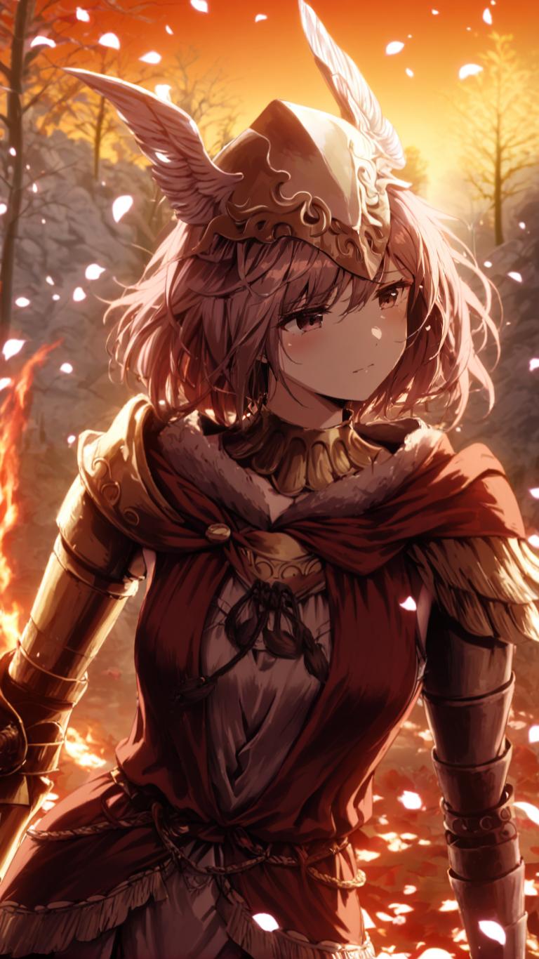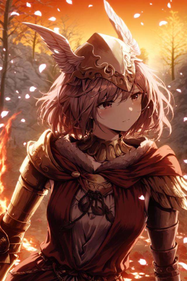 | Prompt | 1girl, wearing malenia-outfit, prosthetic arm, head bent, sad, holding sword, winged helmet, trees, sunset, burning sky, ((petals in the wind)), (romanticism:1.3), <lora:armorify:1> <lora:Realistic000003_1_2.5DAnime_0.05_Merge1:0.4> <lora:w3ers:1>w3ers, |