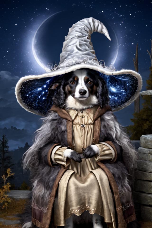 | Prompt | dog (((wearing ranni-outfit))), looking at viewer, full moon, sitting, enigmatic smile, starry sky, <lora:armorify:1> <lora:w3ers:0.7>w3ers, <lora:Realistic000003_1_2.5DAnime_0.05_Merge1:0.8> |