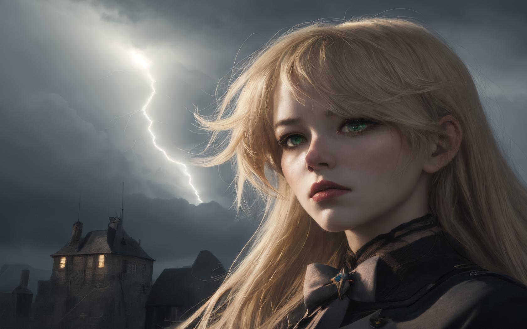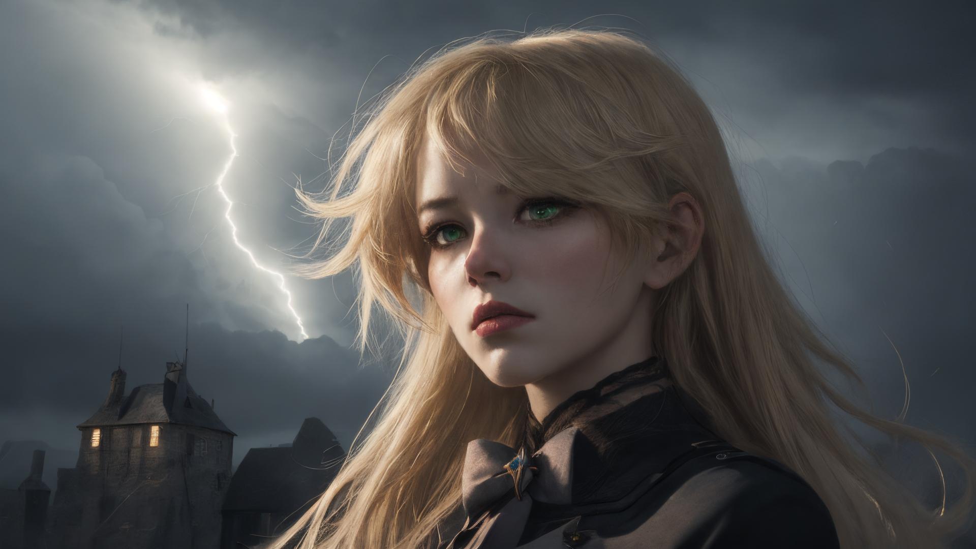 1girl, bangs, blonde hair, bow, castle, cloud, cloudy sky, green eyes, lightning, long hair, outdoors, overcast , parted lips, portrait, realistic, sky, solo, upper body
