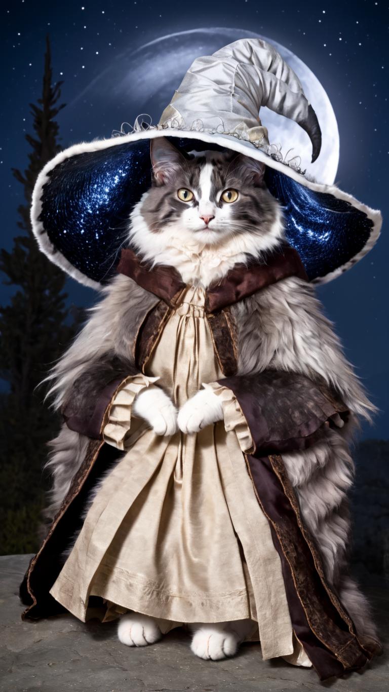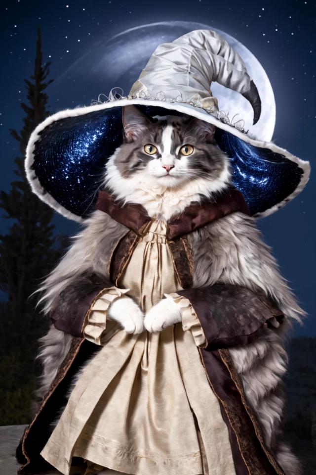 | Prompt | cat (((wearing ranni-outfit))), folded paws, looking at viewer, full moon, sitting, enigmatic smile, starry sky, <lora:armorify:1> <lora:w3ers:0.7>w3ers, <lora:Realistic000003_1_2.5DAnime_0.05_Merge1:0.8> |