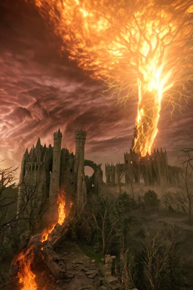 | Prompt | dragon, trees, scenery, burning sky, tornado, maelstrom, no humans, castle ruins, <lora:w3ers:0.9>w3ers, |