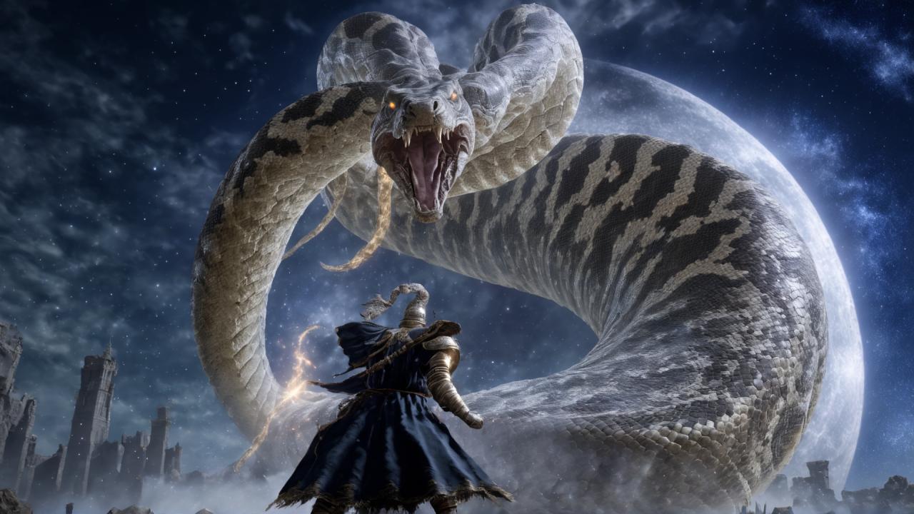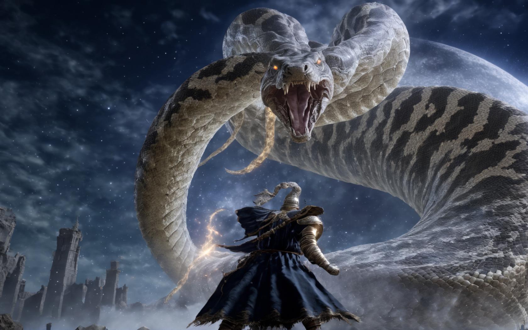 1boy, 1other, ambiguous gender, animal, armor, facing away, from behind, full moon, holding, holding weapon, moon, night, night sky, outdoors, oversized animal , sky, snake, solo, standing, star (sky), sword, weapon