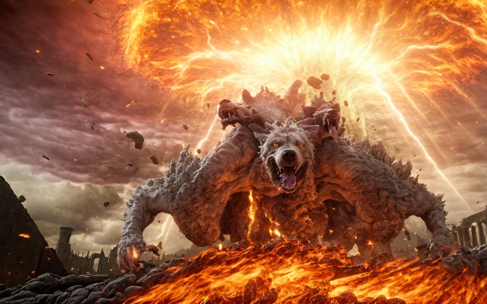 | Prompt | gigantic ethereal hellish three-headed monstruous dogs, burning sky, tornado, maelstrom, ruins,meteor swarm, dynamic, magic, magical spell, fireball, (eerie lighting,promotional poster), <lora:w3ers:1>w3ers, |