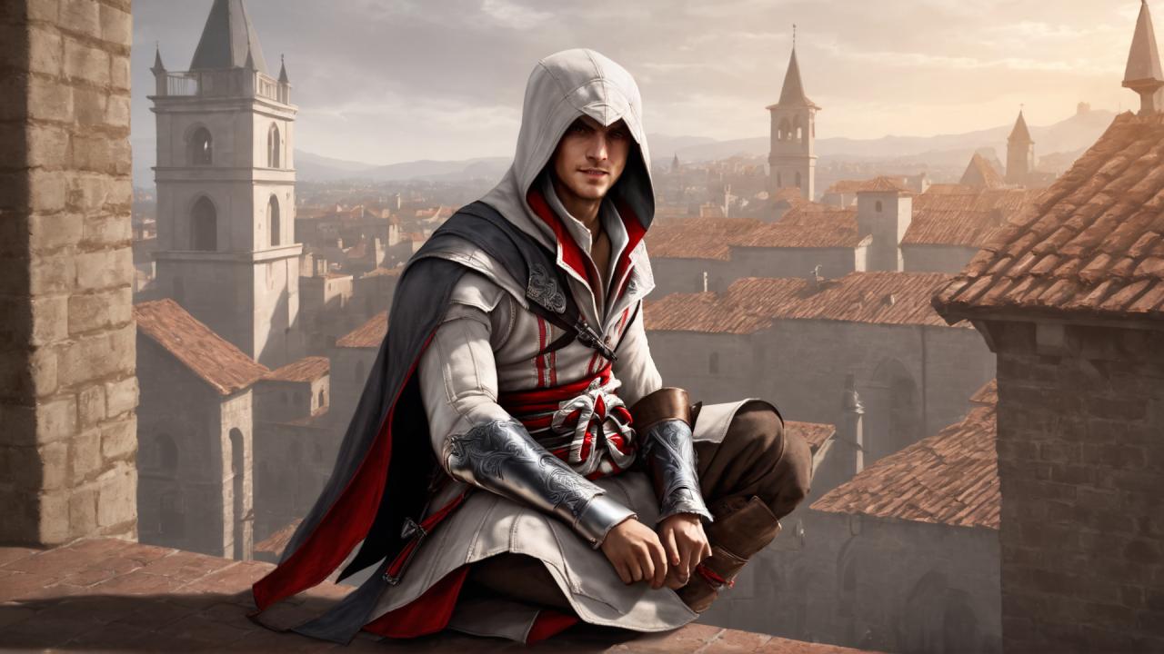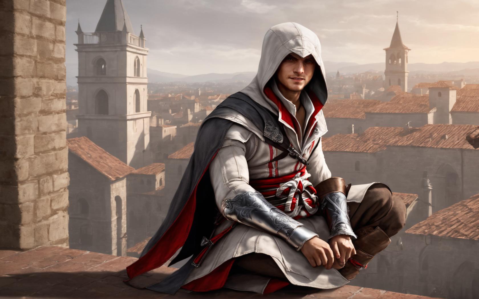 | Prompt | 1boy,wearing ezio-outfit, light evil smile, enigmatic, murderous glance, sitting atop medieval bell tower, one knee to chest, wind, medieval fantasy town background, <lora:armorify:1> <lora:Realistic000003_1_2.5DAnime_0.05_Merge1:0.5> |